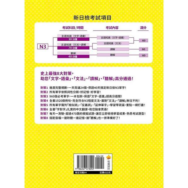 本書精選960個N3必考單字,搭配符合N3文法的例句,加上模擬實際題型的「實力測驗」,只要40天!在記憶單字的同時,完全掌握「言語知識(文字‧語彙)」、「言語知識(文法)‧讀解」、「聽解」,保證滿分手到擒來!