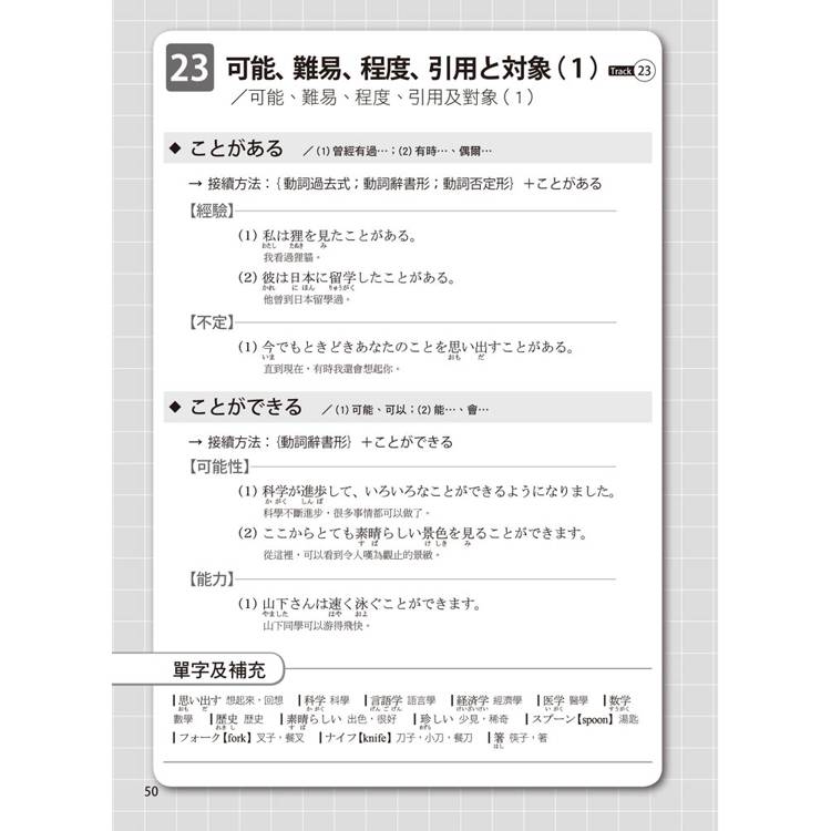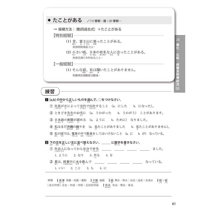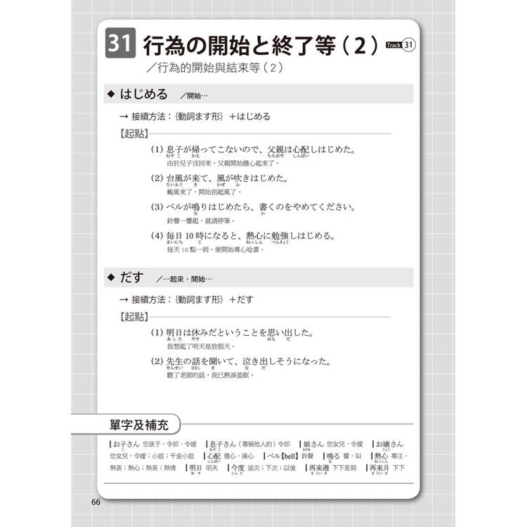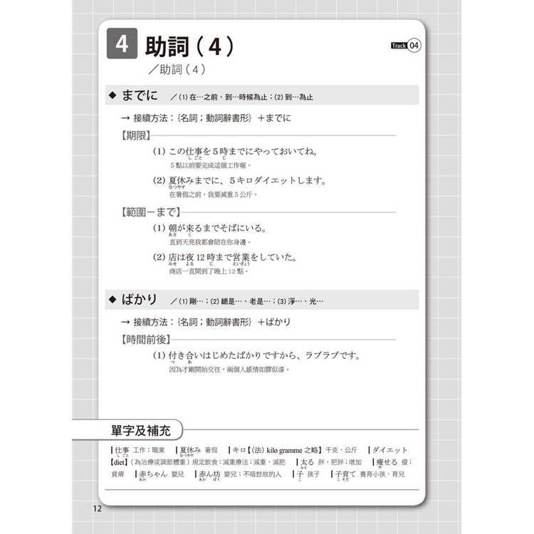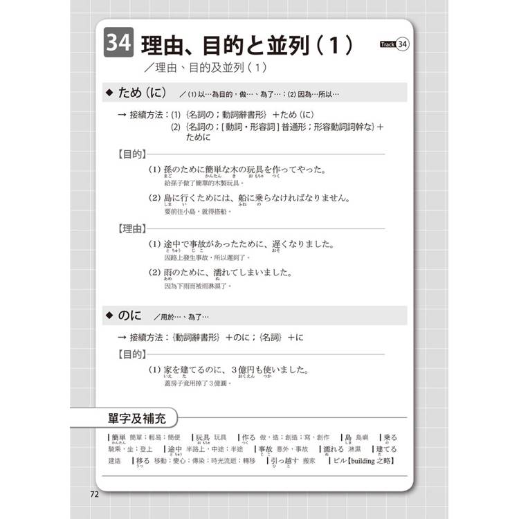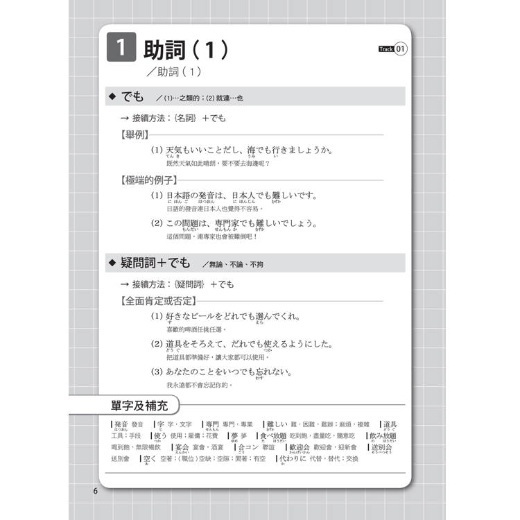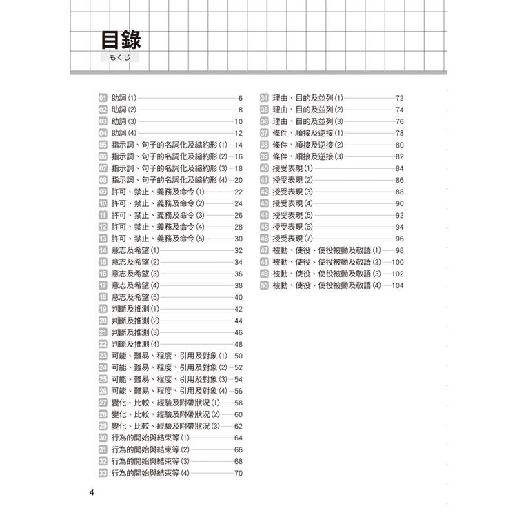 每個單元的文法都按50音順序排列,書末還有超實用的文法索引表,讓您需要回顧或查找文法時,這本書就是您的私人助理。搜尋一個文法,自動帶出相似文法,學習效果加倍!