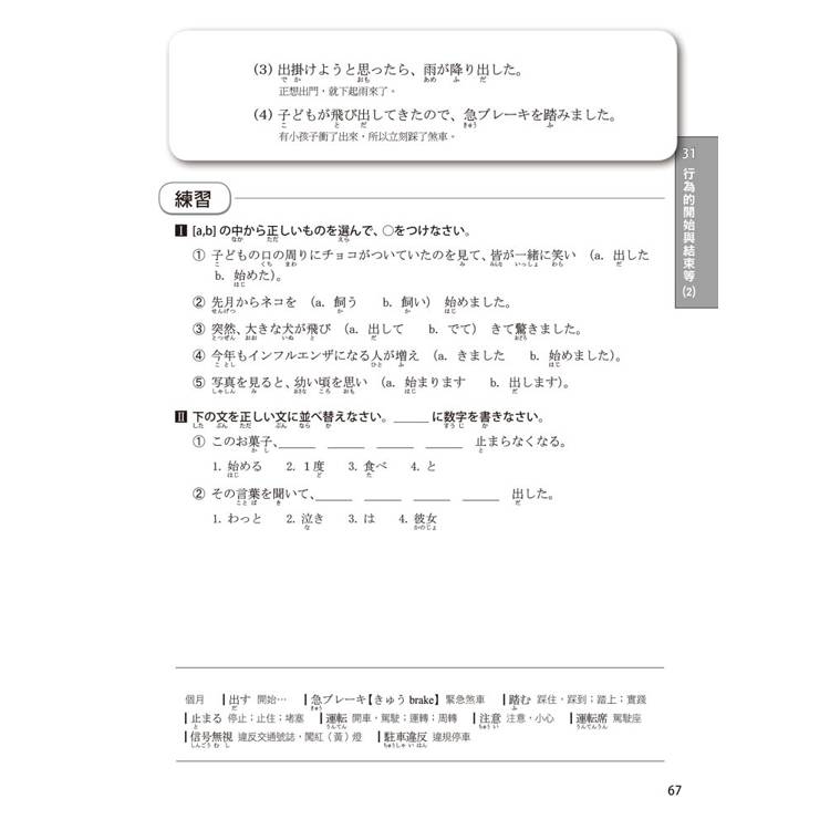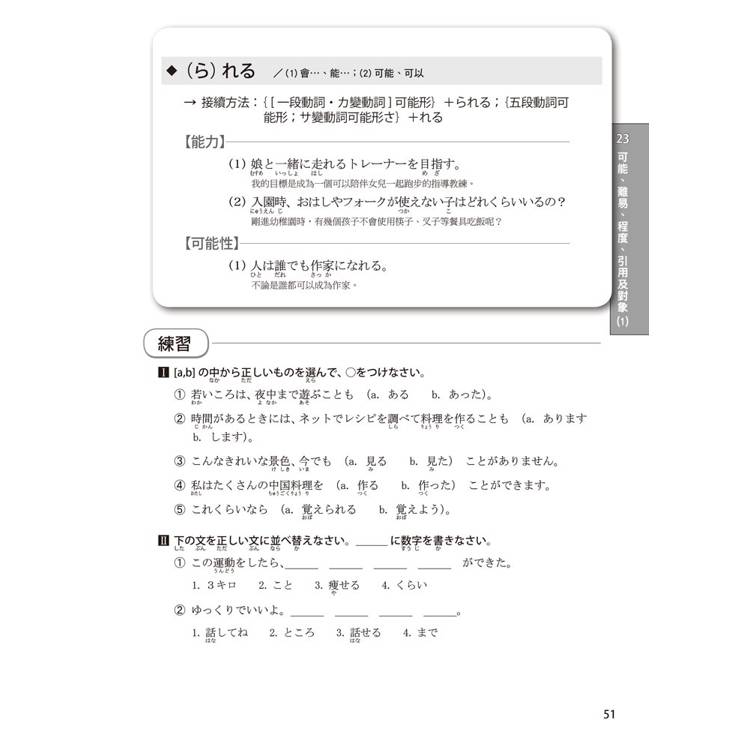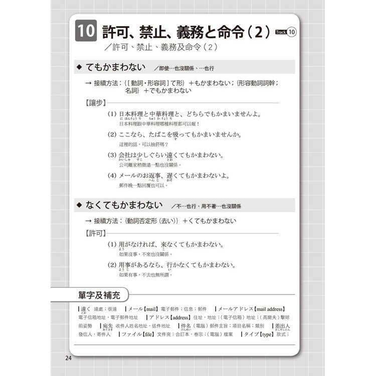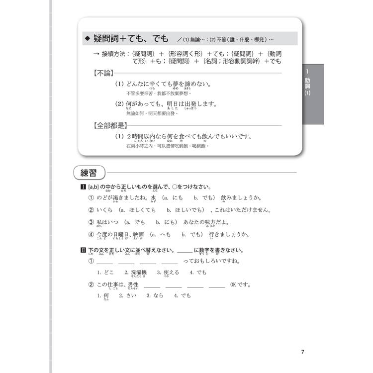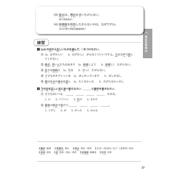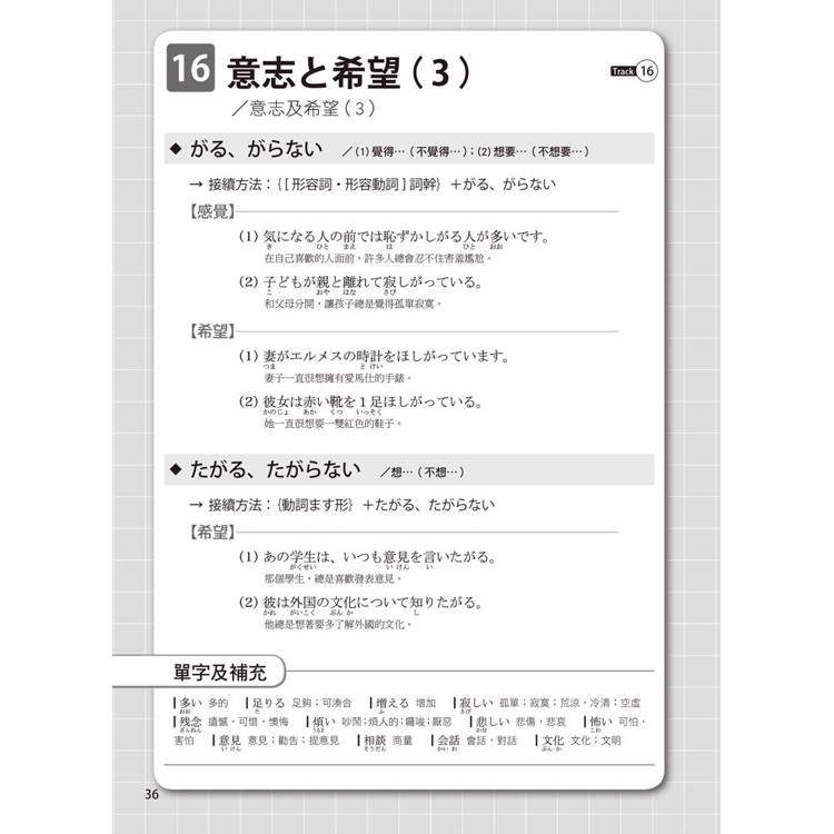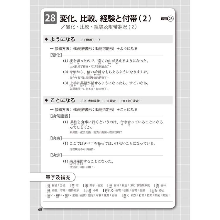 每個單元的文法都按50音順序排列,書末還有超實用的文法索引表,讓您需要回顧或查找文法時,這本書就是您的私人助理。搜尋一個文法,自動帶出相似文法,學習效果加倍!