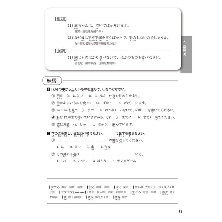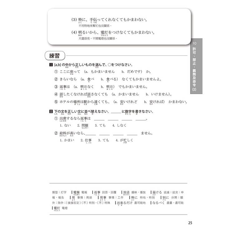 讀者真心話:“零碎文法太難記,綁在一起記效果驚人!”按照N4考試內容,本書將文法按許可、比較、希望、意志等機能分類,讓您一次掌握所有生活中大大小小的文法!細微差異對比,讓您一次搞懂相似用法,不再混淆。