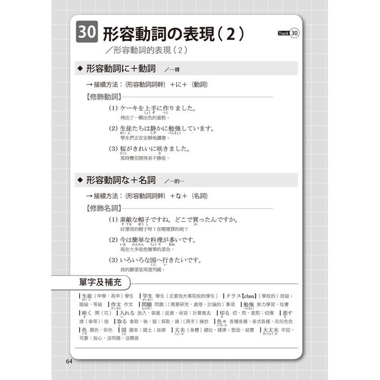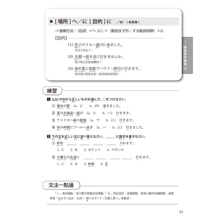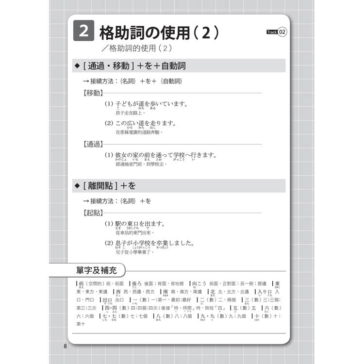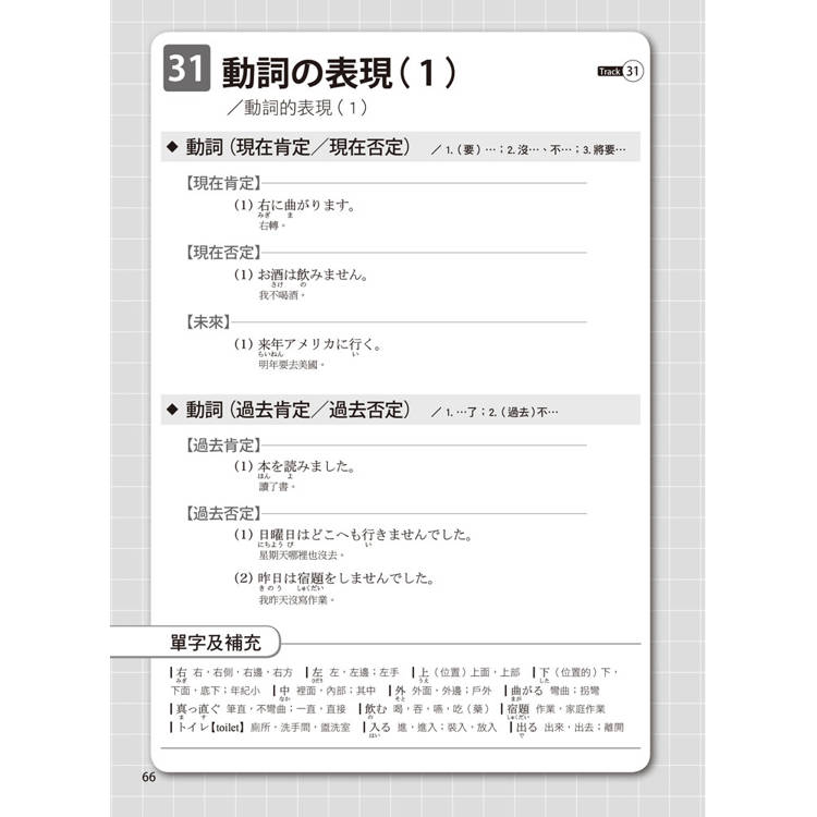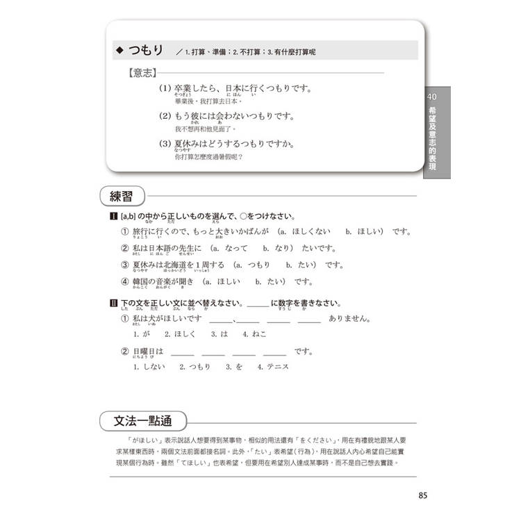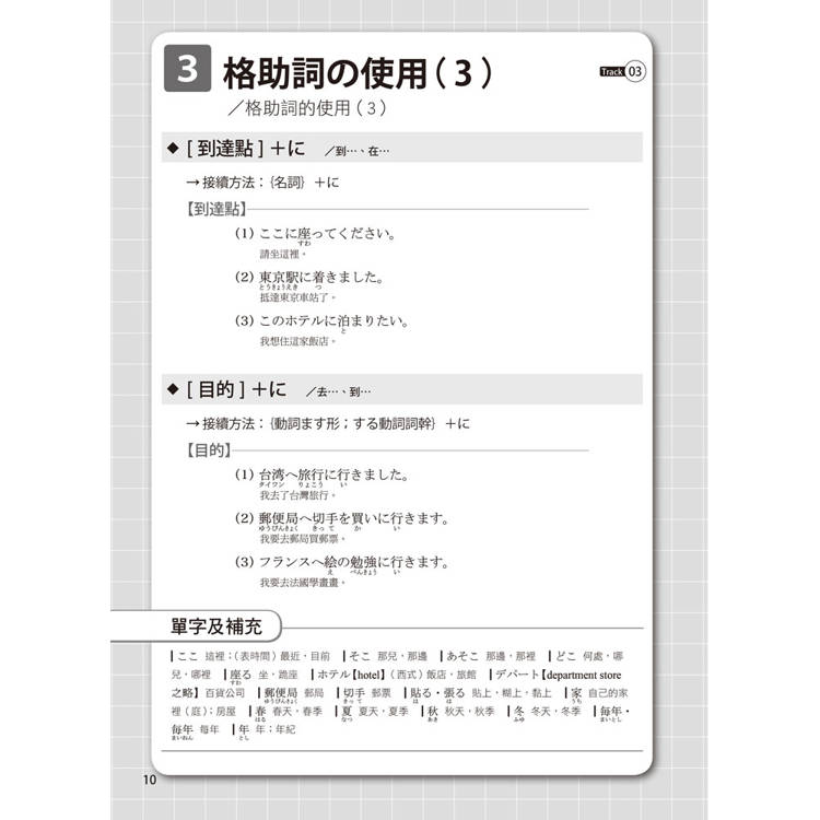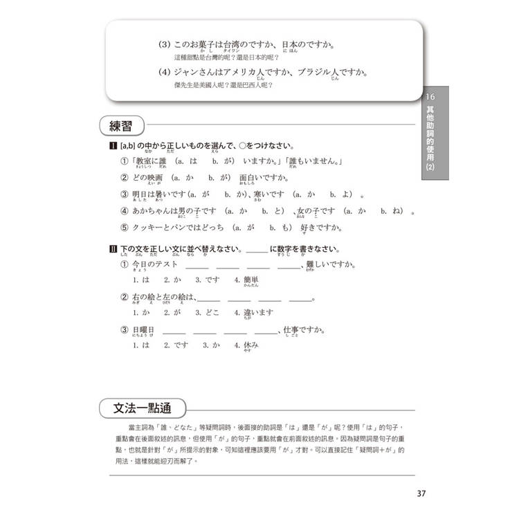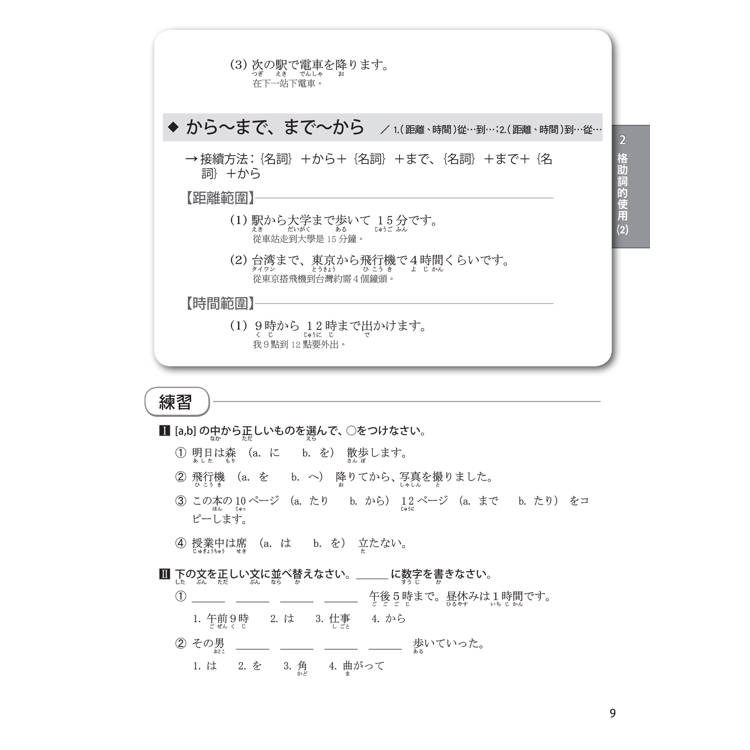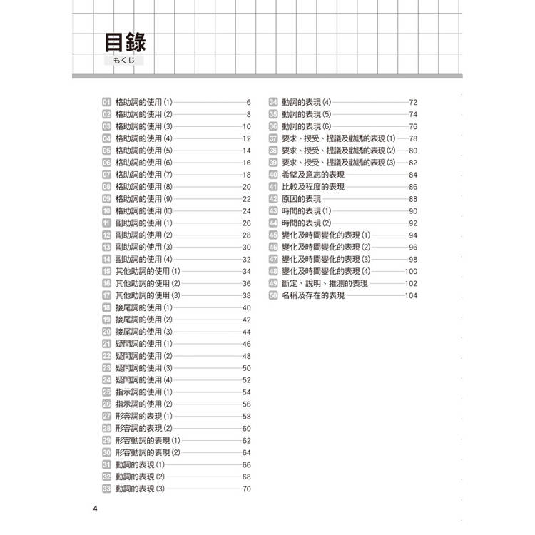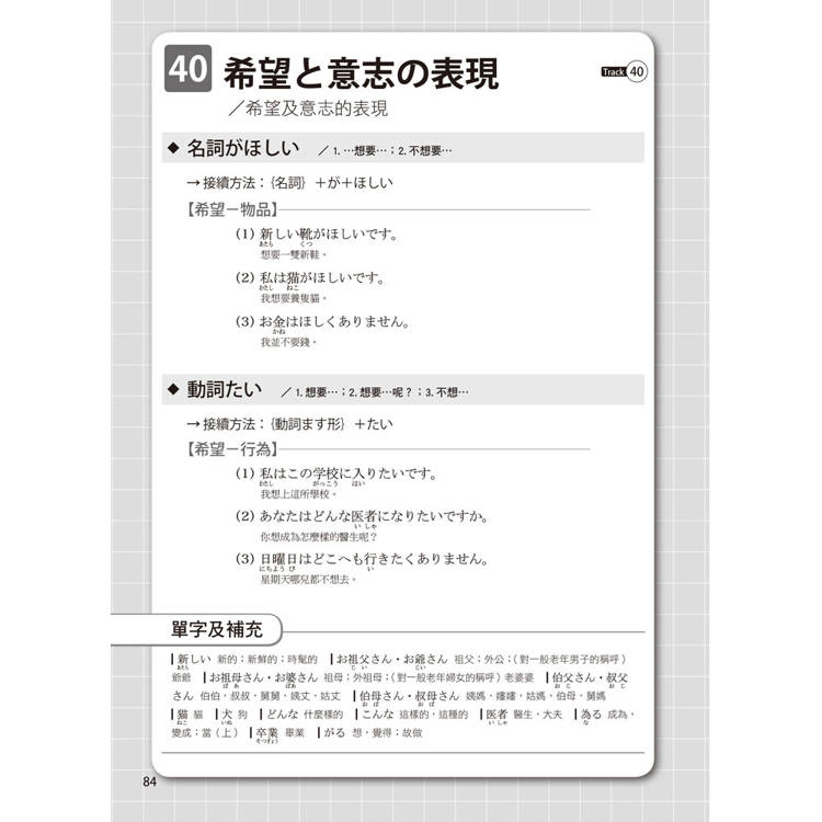 根據N5考試設計,全面涵蓋各種文法機能,從表達要求、授受,到原因、時間表現,讓生硬的文法自然融入生活,像喝水一樣輕鬆掌握!