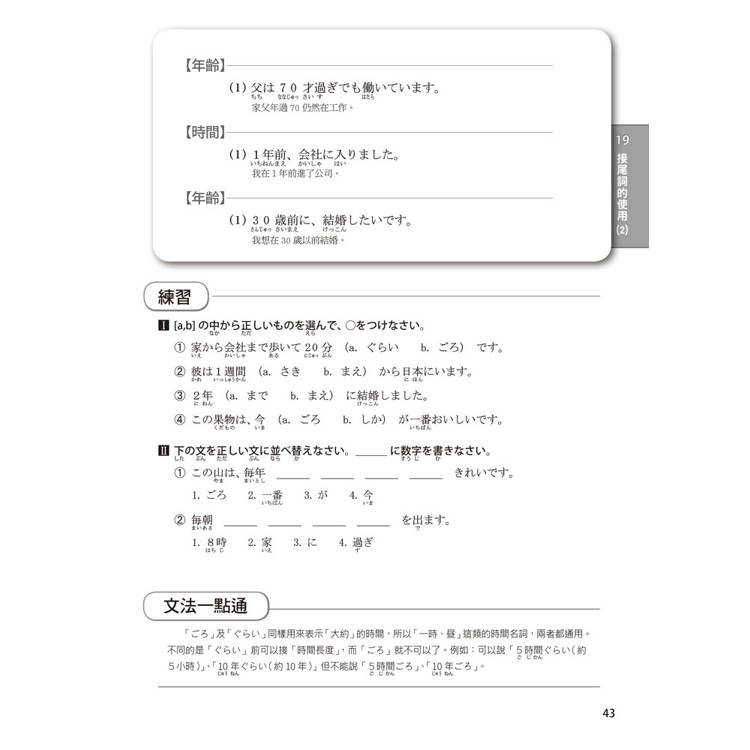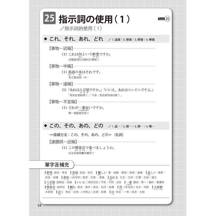 每個單元的文法都按50音順序排列,書末還有超實用的文法索引表,讓您需要回顧或查找文法時,這本書就是您的私人助理。搜尋一個文法,自動帶出相似文法,學習效果加倍!