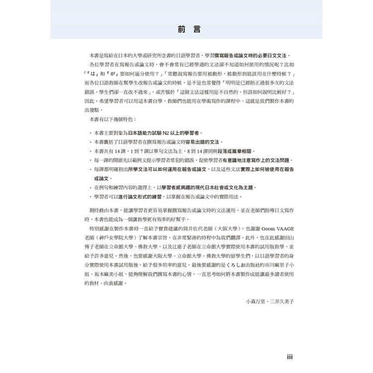 各位學習者在寫報告或論文時,會不會常有已經學過的文法卻不知道如何使用的情況呢?比如「『は』和『が』要如何區分使用?」「常聽說寫報告要用被動形,被動形到底該用在什麼時候?」而各位日語教師在幫學生改報告或論文的時候,是不是也常覺得「明明是已經指正過很多次的文法錯誤,學生們卻一直改不過來」,或苦惱於「這個文法這樣用是不自然的,但該如何說明比較好?」因此,希望學習者可以用這本書自學,教師們也能用在學術寫作的課程中,這就是我們製作本書的出發點。