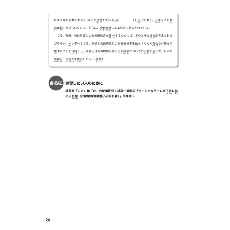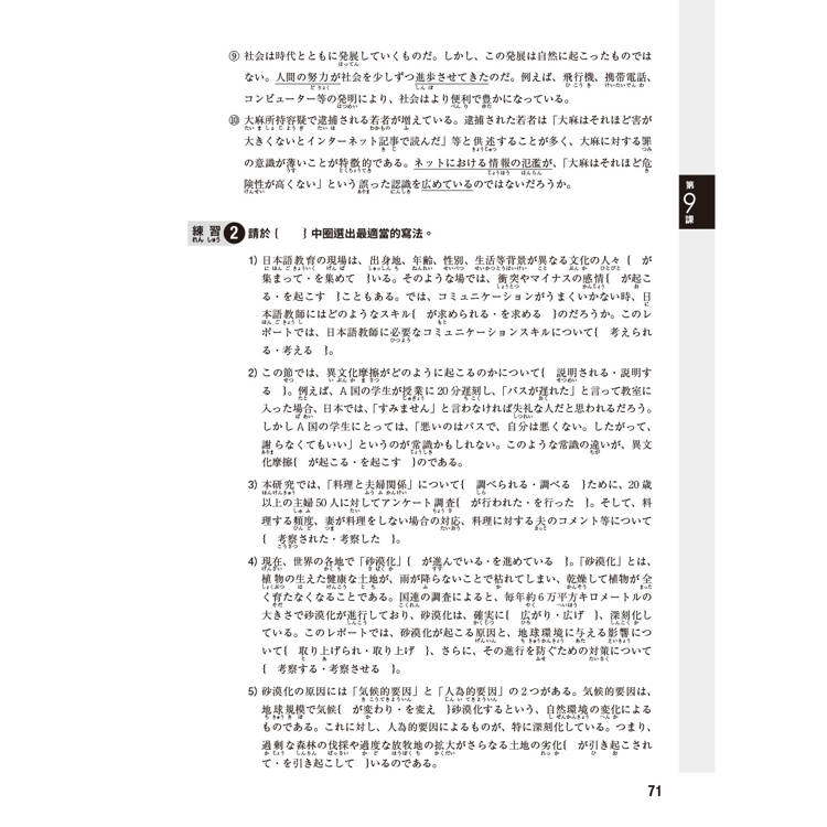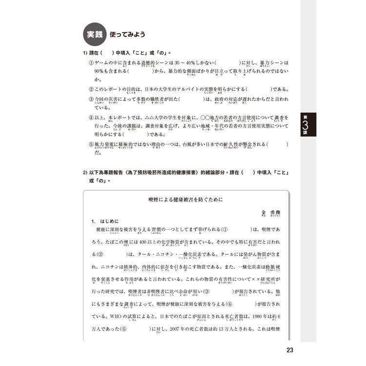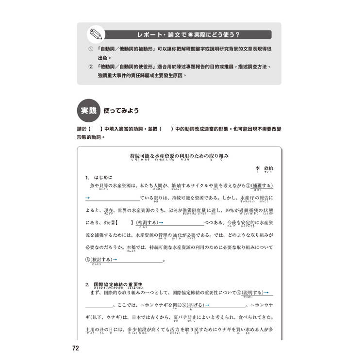 每堂課結束後,還有針對全課的練習「実践 使ってみよう」,出題形式直接以論文的一部分文章(緒論、本論或結論),以填空、改寫方式讓學習者練習,全書約有30篇,方便教師作為上課素材。