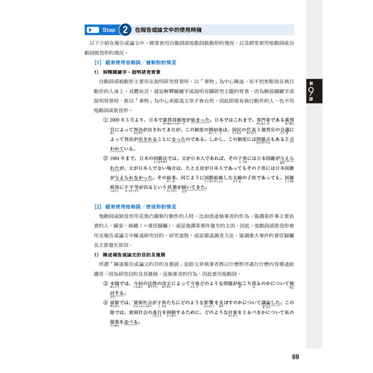 ・每課都明確指出所學文法可以如何運用在報告或論文中,以及這些文法實際上如何被使用在報告或論文裡。