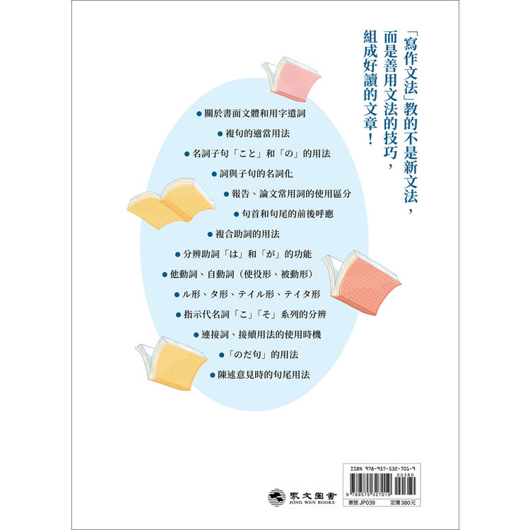 期待藉由本書,能讓學習者更容易掌握撰寫報告或論文時的文法運用,並在老師們指導日文寫作時,本書也能成為一個讓教學更有效率的好幫手。