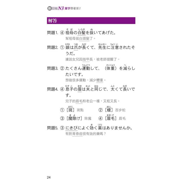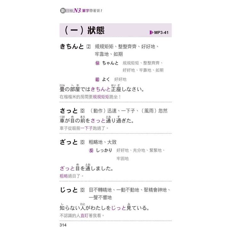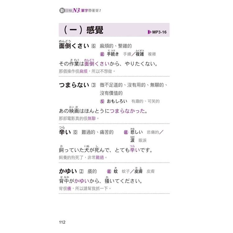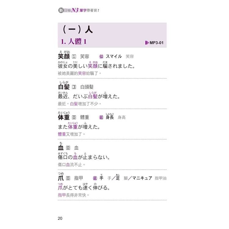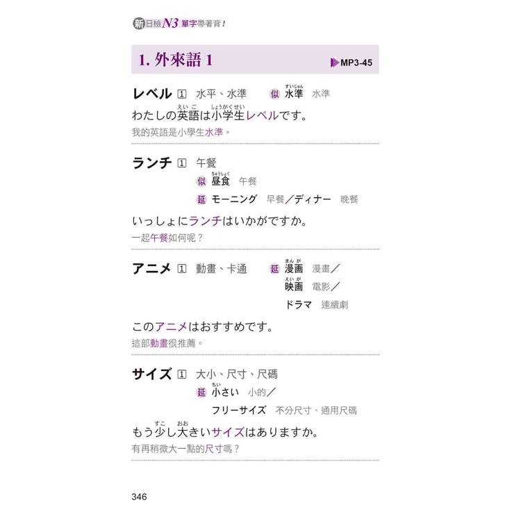 書中每一個單字均明確標示「重音」,還列出相關延伸學習,包含「似:意思相似的單字」、「反:意思相反的單字」、「延:延伸學習的單字」,並一一附上最實用的例句+最正確的中文翻譯。不但能讓您立即熟記單字,猶如樹狀圖的學習方式,更能讓您綿密地掌握N3必考相關單字。