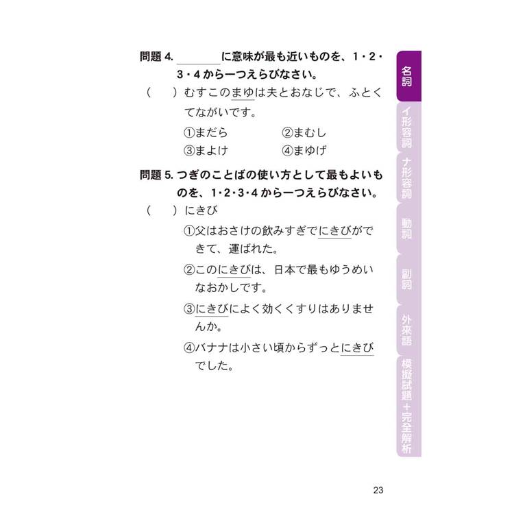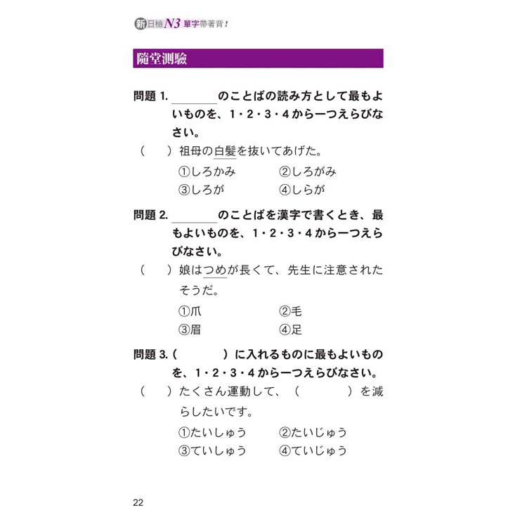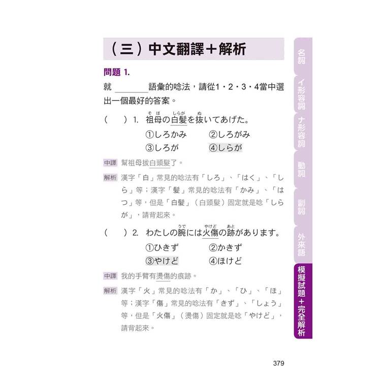 本書的每個分類後面均有「隨堂測驗」。此外,全書最後還有「模擬試題」。針對試題的解答、中譯、解析,都是協助您面對實際「言語知識」考科時的最佳利器。
