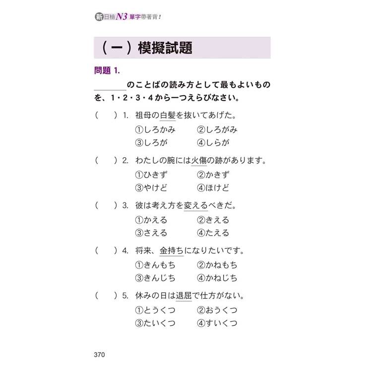 要通過日語檢定,第一步就是要背單字!《新日檢N3單字帶著背!新版》將N3必考單字一網打盡,先用詞性編排,再用運用主題式整理,搭配朗讀音檔,讓您好學好記!還有數百題模擬試題,隨身帶著背,保證高分合格!