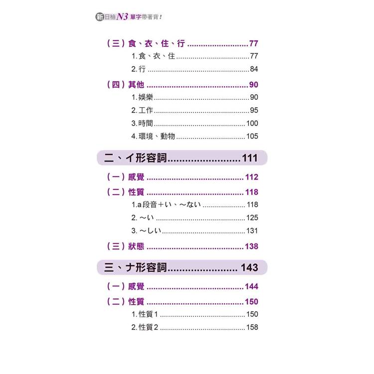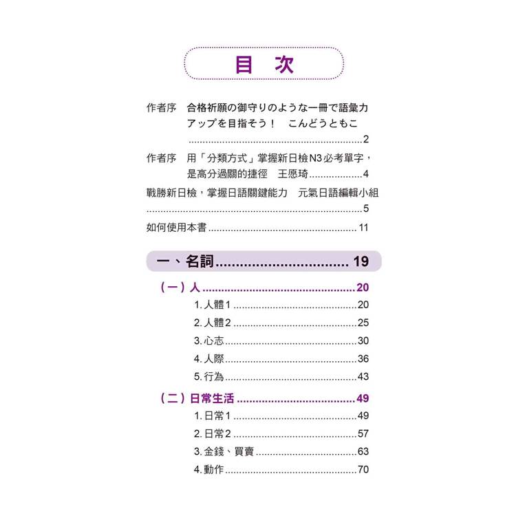 本書將所有N3單字依照詞性的不同分成七大類,分別是「名詞」、「イ形容詞」、「ナ形容詞」、「動詞」、「副詞」、「外來語」。接著再在各大類下細分各個小項目,例如「名詞」下可分為:人、日常生活、食、衣、住、行等等,群組記憶單字,好記不遺漏!