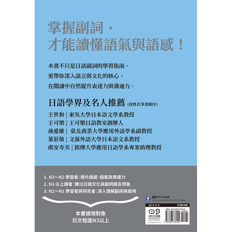 不管你是日語學習者、語言研究者,還是只是單純對日文有興趣,都能從這本書裡看到副詞的魅力。學會副詞,能讓你的日語表達更自然、更生動,也更貼近日本人的思考方式,大幅提升你的日語表達力及溝通能力。