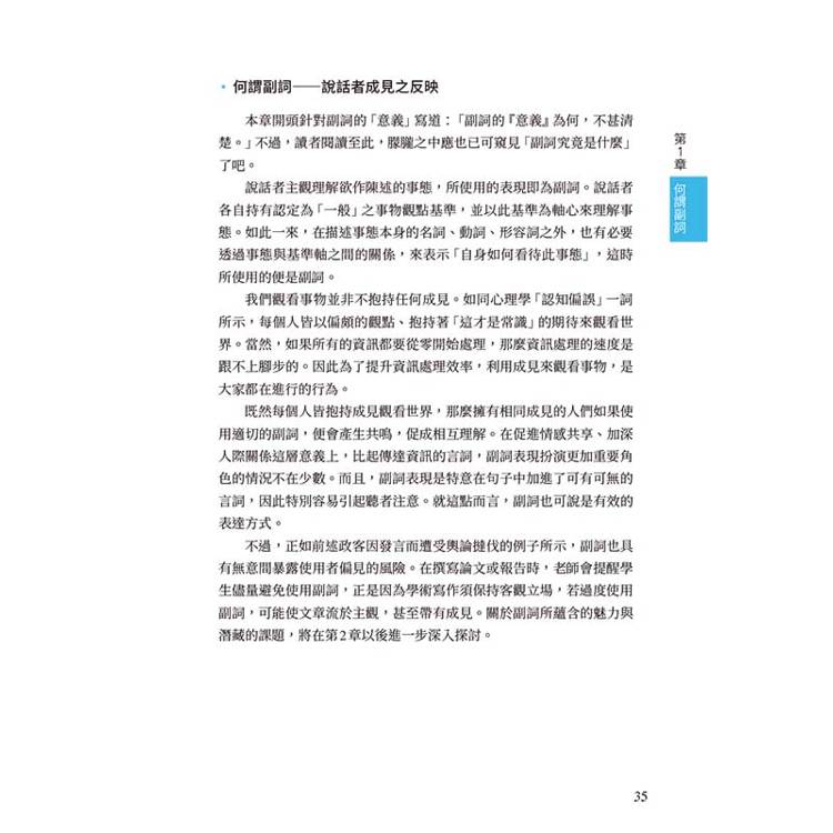 不過,正如前述政客因發言而遭受輿論撻伐的例子所示,副詞也具有無意間暴露使用者偏見的風險。在撰寫論文或報告時,老師會提醒學生儘量避免使用副詞,正是因為學術寫作須保持客觀立場,若過度使用副詞,可能使文章流於主觀,甚至帶有成見。關於副詞所蘊含的魅力與潛藏的課題,將在第2章以後進一步深入探討。