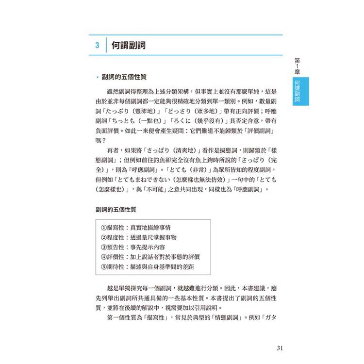 越是單獨探究每一個副詞,就越難進行分類。因此,本書建議,應先列舉出副詞所共通具備的一些基本性質。本書提出了副詞的五個性質,並將在後續的解說中,視需要加以引用說明。