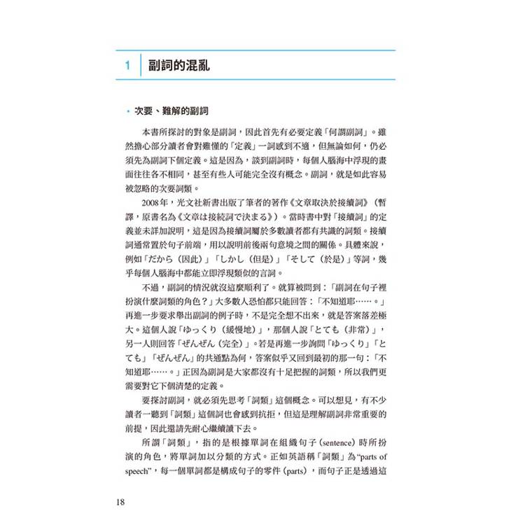 將看似混亂的日語副詞進行系統性整理,劃分為情態、程度、預告、審視等細緻類別,清晰解析其性質並幫助讀者建立扎實的副詞知識體系。