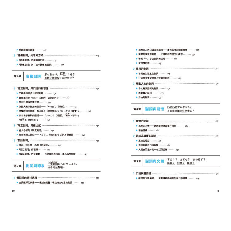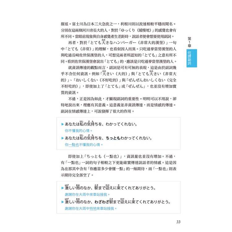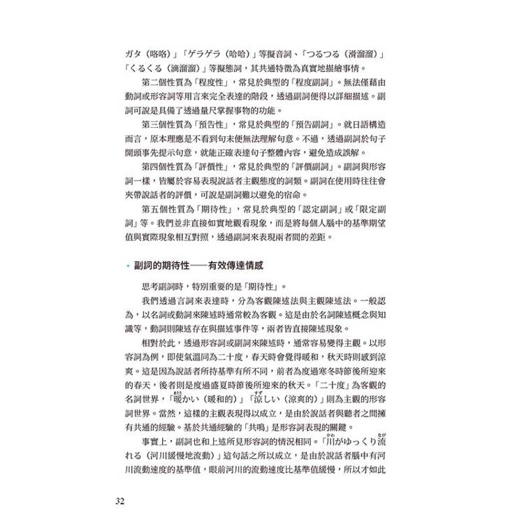 至於副詞如何傳達細膩的情感,像是「とても」是否真能對應中文的「非常」概念、「適当に」究竟是表達「隨便地」還是「確實地」、「さすが」是否需要加上「に」……容我在此暫且賣個關子,留待讀者親自於書中細細探尋。