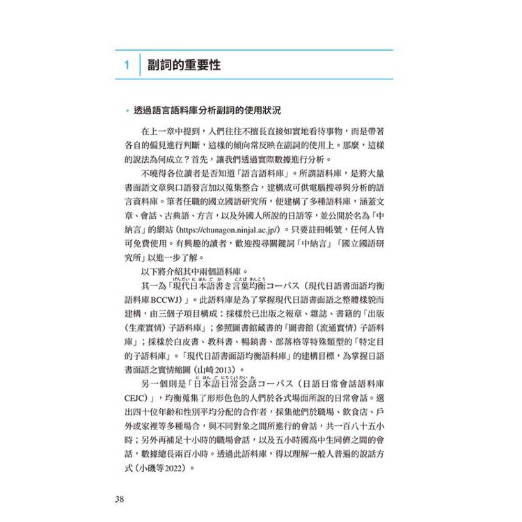 不只講文法,本書也運用語料庫分析實際的例子,告訴你副詞在日常對話、文章、甚至歌詞裡是怎麼用的。比方說,像「ドキドキ」「しっかり」「なんか」這類副詞,怎麼幫說話者加強語氣,如何讓說出的日語更有畫面感? 這些問題都可以在本書找到答案。