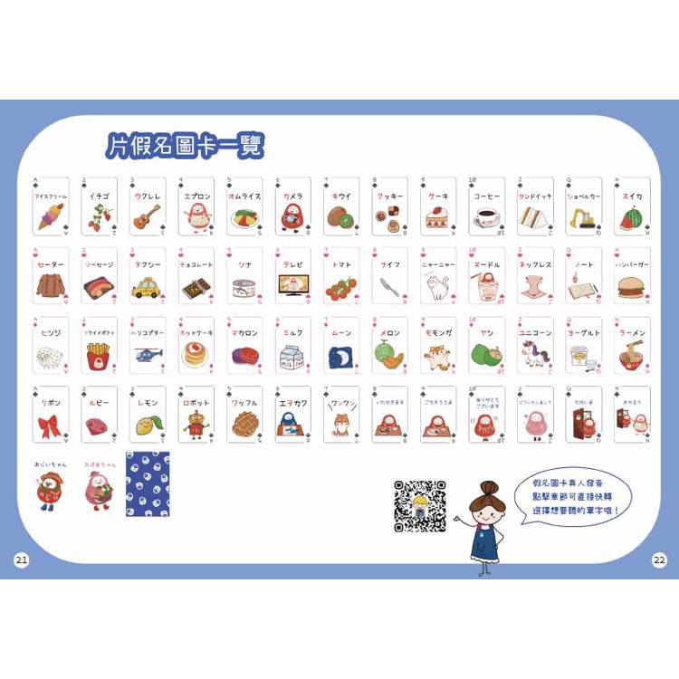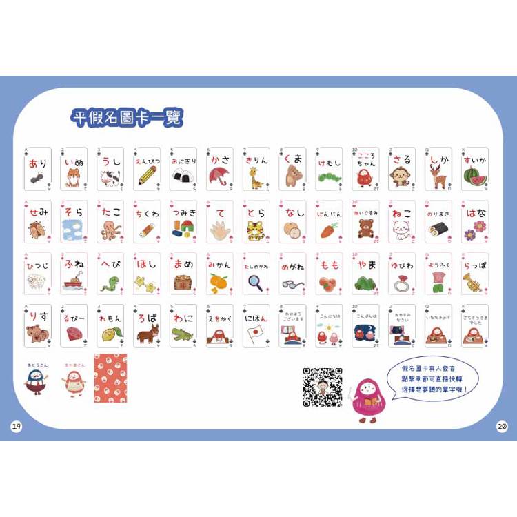 • 單字音檔:書籍內一覽表中有QR code,掃描即可聽到日本人標準發音,收錄所有撲克牌上的單字,方便家長與孩子正確學習。