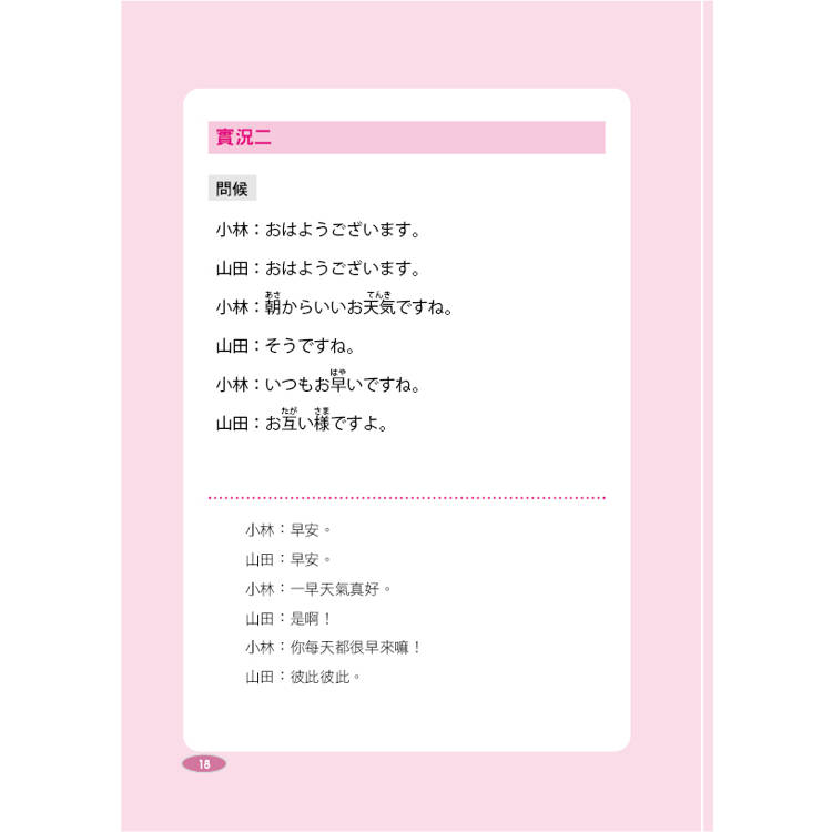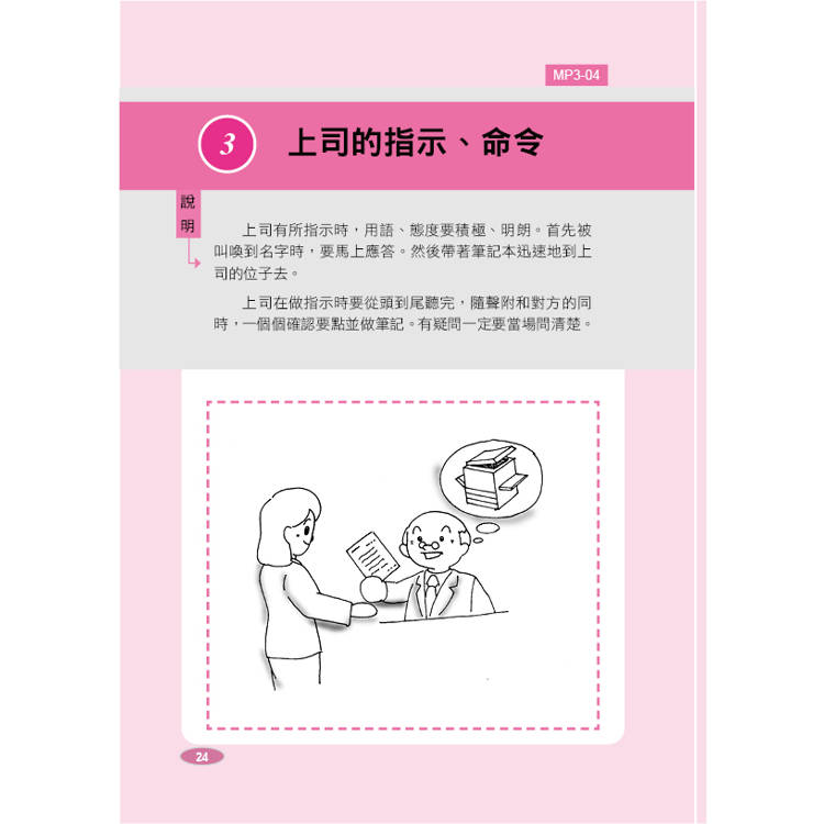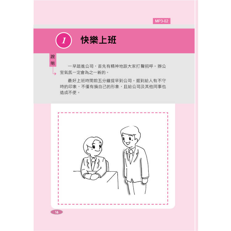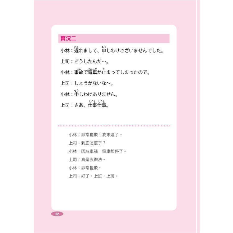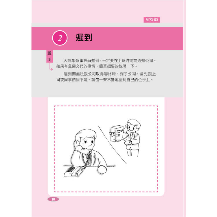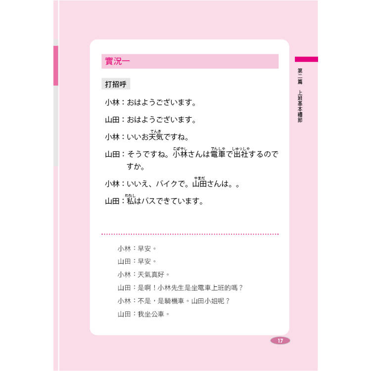 實況會話單元,收集職場商務上各種應對進退的場面,舉凡基本禮節、訪客接待、拜訪客戶、電話應對、招待及宴會、送禮等等最常用的日語會話,應有盡有。