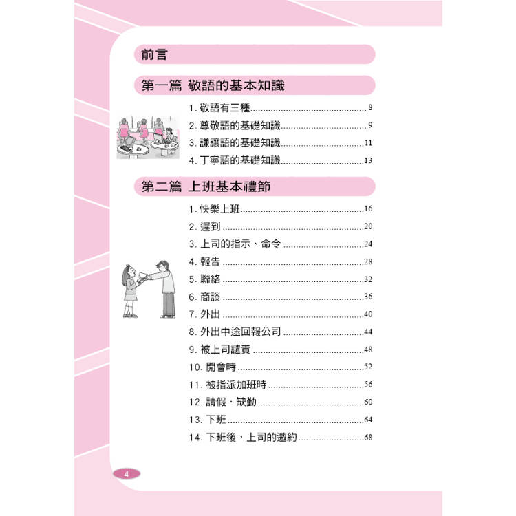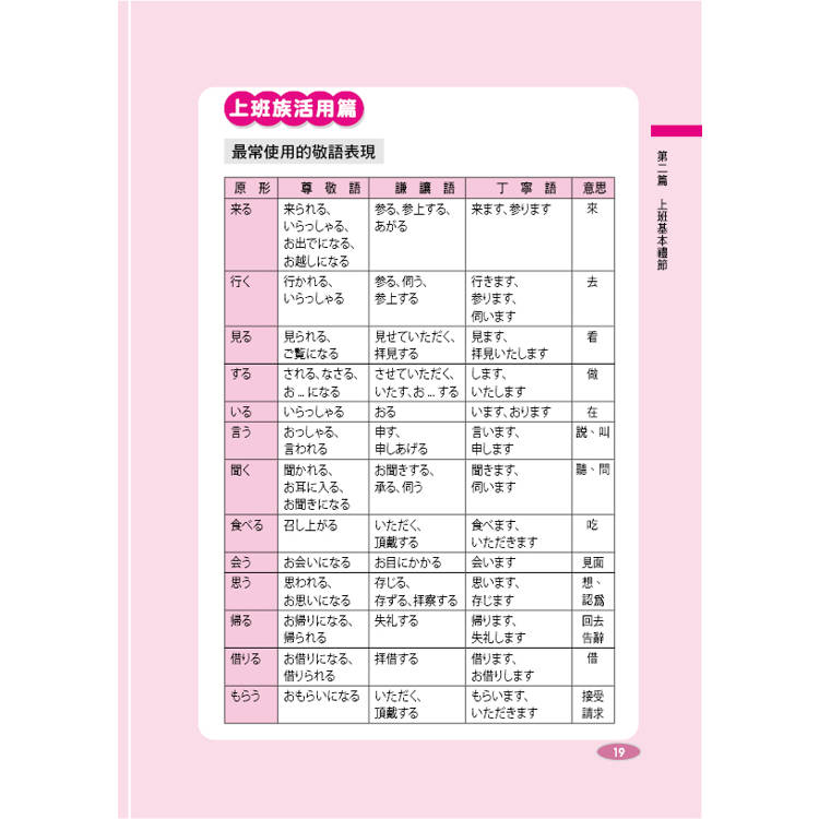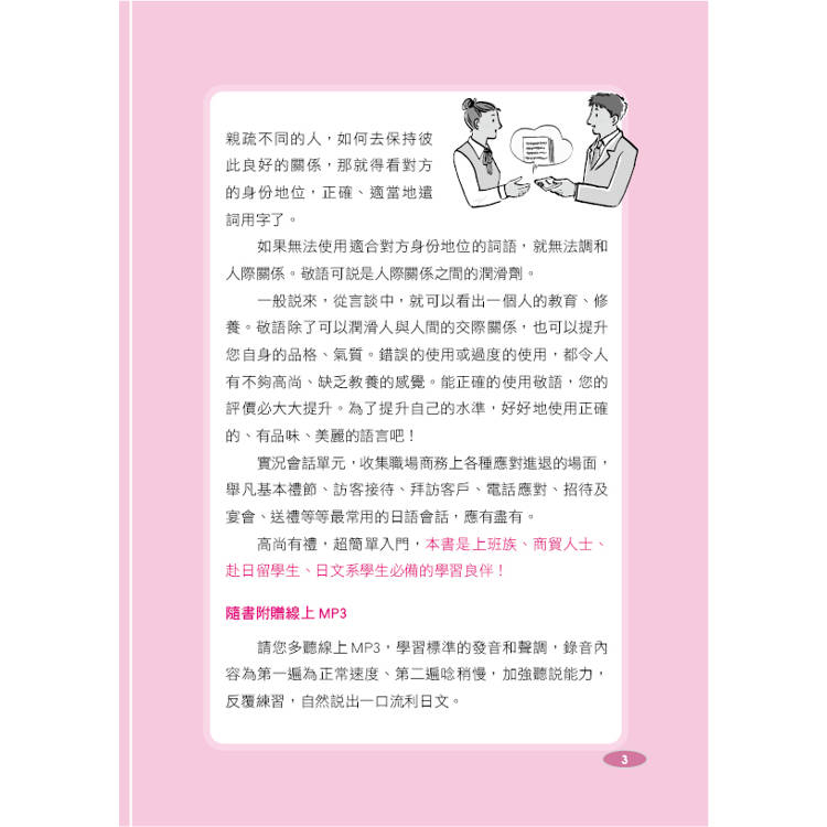 日本商務上的基本禮儀,最重要的就是敬語的使用。敬語表達說話者,對聽者的尊敬深淺程度。如何在工作中面對許多地位、年齡、親疏不同的人,例如上司、同事、前輩、晚輩,以及生意上往來的客戶、廠商,而能保持良好的關係呢?
