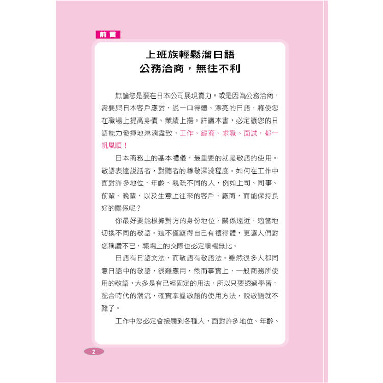 無論您是要在日本公司展現賣力,或是因為公務洽商,需要與日本客戶應對,說一口得體、漂亮的日語,將使您在職場上提高身價、業績上揚。詳讀本書,必定讓您的日語能力發揮地淋漓盡致,工作、經商、求職、面試,都一帆風順!