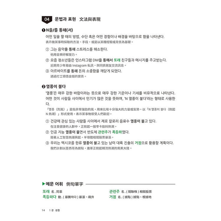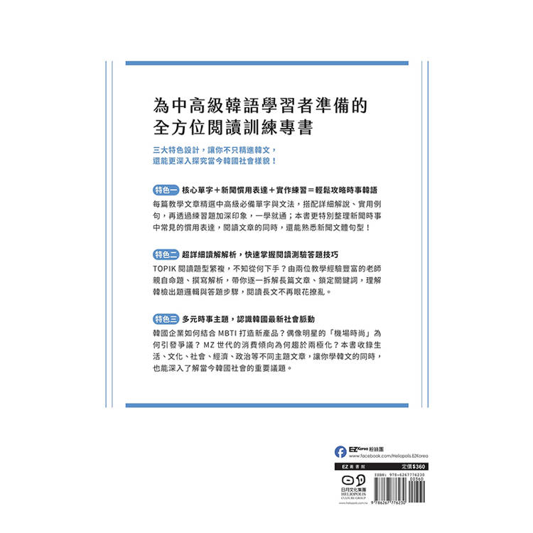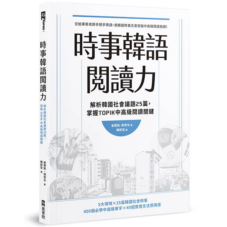 基於這種問題意識,本教材是針對高階學習者設計,以時事閱讀為中心的韓語教材。除了單字和文法學習之外,更以當前韓國社會重要的時事議題作為主題,讓學習者能夠自然地熟悉在實際新聞中,經常會遇到的表達和句子。