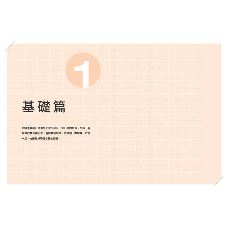 本書從日語的基礎語言知識出發,依序介紹文法運用以及常用語彙,由此引導讀者學習日語文法的基本架構。其中,第一章為「基礎篇」,介紹日語的假名、品詞、各詞類的基本變化與時式,以及代名詞、數字之用法。第二章為「文法運用篇」,以日語「用言」第一、二、四變化的應用為中心,說明各變化常用的各類句型。第三章則是「語彙篇」,收錄以名詞為首11種詞類的常用單字及其相關解說。第四章「附錄」彙整初階日語之會話用語及單字,以利學習。