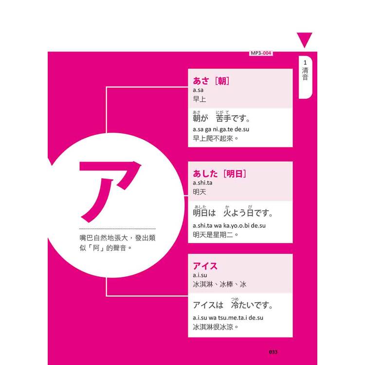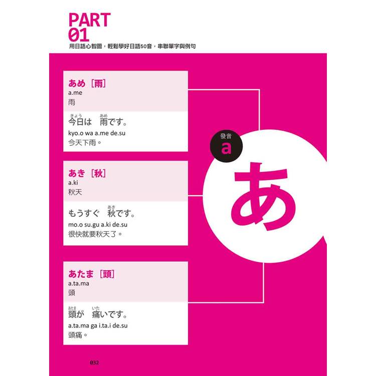 到了PART01,將帶領你由50音邁向單字和例句,每個對應的平假名與片假名都有發音說明,並延伸出6個單字、6個例句。例如從清音「あ、ア(a)」作為起點,接著認識關聯的單字「あめ(a.me)雨」、「アイス(a.i.su)冰淇淋、冰棒」,最後延伸學習單字的例句「今日は 雨です。(kyo.o wa a.me de.su)今天下雨」、「アイスは 冷たいです。(a.i.su wa tsu.me.ta.i de.su)冰淇淋很冰涼」,如此的串聯,將使你一氣呵成,學好「50音‧單字‧句子」。