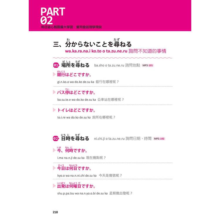 進入到PART02後,便隨即利用在PART00和PART01所學過的假名、單字和句子的結構,擴大學習「會話」。本單元的會話觸及日常生活中常見的場景,包含「初次見面」、「表達喜怒哀樂」、「詢問不知道的事情」、「傳達想說的話」共4大主題、25類情境,這些豐富的內容搭配上日籍作者親錄的標準東京腔音檔,邊聽邊跟著模仿,相信一開口就能說出最標準的日語。
