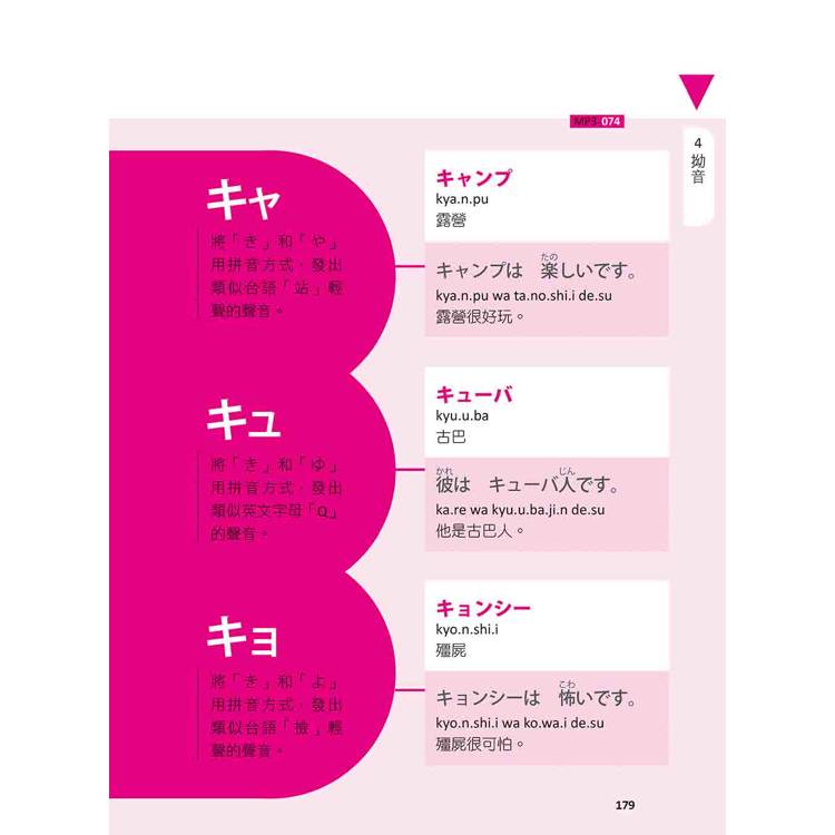 全書假名、單字、例句和會話都標示羅馬拼音,除此之外,發音說明中也使用注音、中文和台語來加強輔助,讓你發音好容易、好標準!