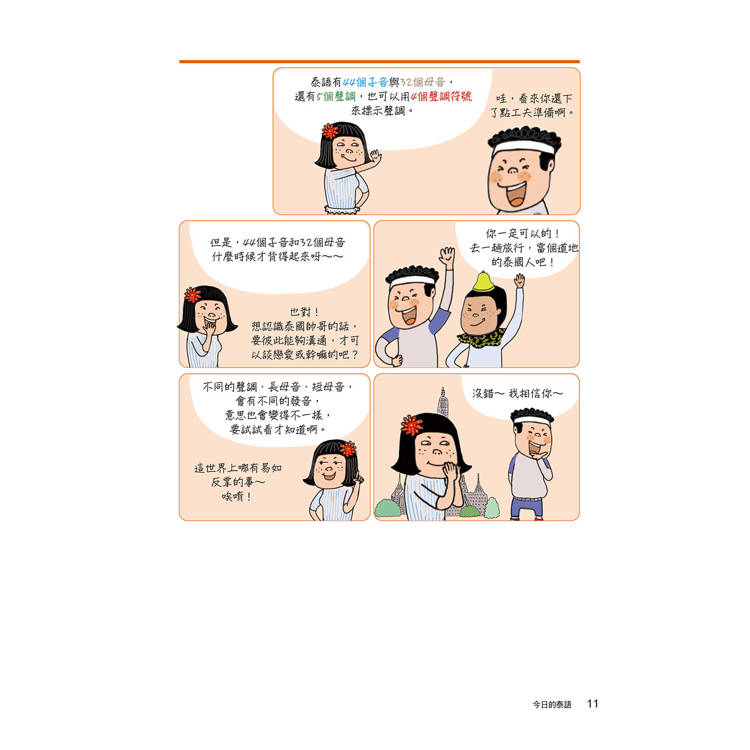 首先在發音的部分,用最流通的羅馬拼音輔助模擬出最接近泰語的字母發音,講解如何記下每一個音;接著在基本會話的部分,會先教打招呼、問候等最基礎也最重要的表達,在熟稔這些表達後,便會進入正式課文。配合前面紮根的兩項基礎,便可在泰語道地的語調中、學習到生活必需的泰語會話以及泰語文法。另外在課文的最後不時穿插精采的泰國文化說明單元,能在學習的同時更加感受到泰國的魅力。
