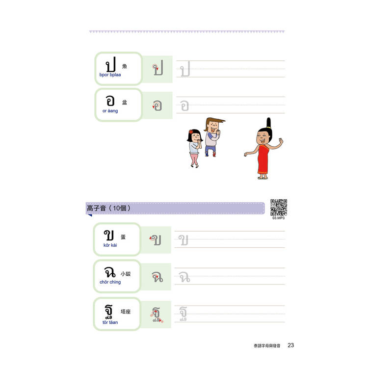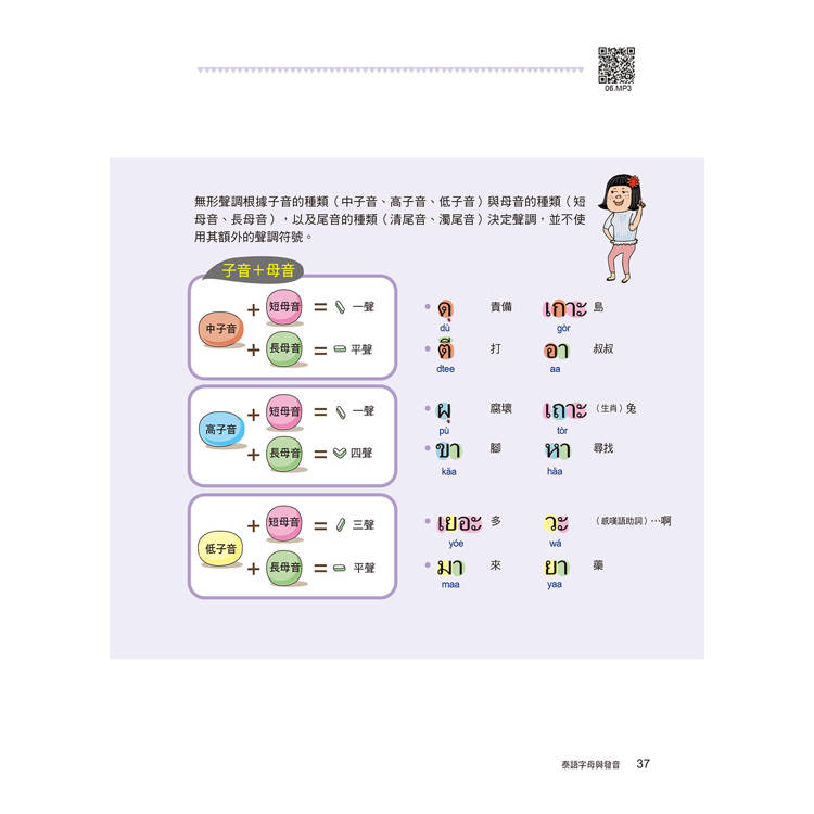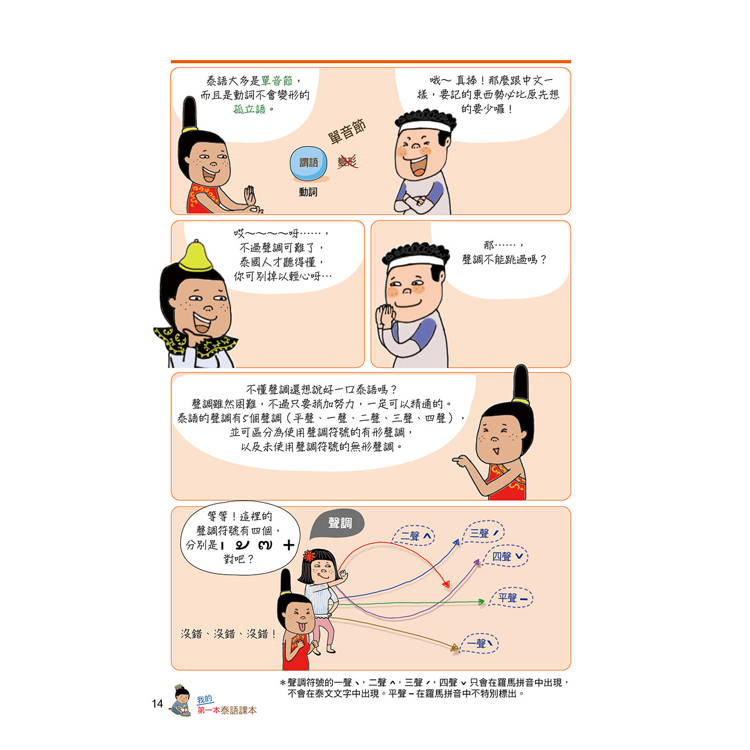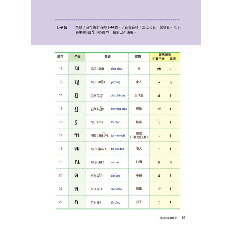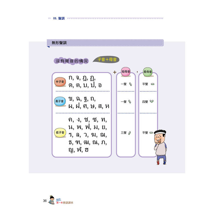 泰語是一種乍看到字形時,不見得能精準唸出發音的語言。子音總共44個、母音32個,聲調5種。其中子音又分為低子音、中子音、高子音三種,依接續的母音不同,會產生不同的發音聲調。因此在基礎字母的學習上必須下很大的功夫才行。本書清楚地將泰文的24個低子音、9個中子音、11個高子音分類學習,每個子、母音也都附有最流通的羅馬拼音協助發音練習,並透過許多詳細的表格圖解,讓讀者能清楚地分類出哪個子音碰到哪個母音時,應該念出哪個聲調,並附有基本泰文數字練習。本書還有書寫格,讓你透過書寫熟悉泰國文字。所有的字母規則規劃成一大章節,作最詳盡的解說。