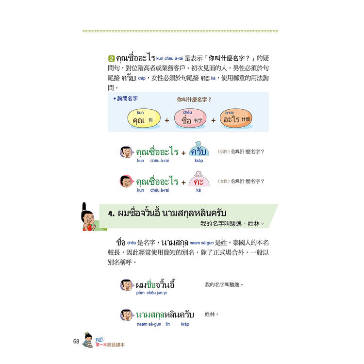 在泰國如果用手指指著國王是不禮貌的,就算是照片也不行,你知道嗎?泰拳的技巧是怎麼樣?在比賽前選手們又會做什麼事來提升自己的運氣呢?還有多少泰國美食能夠讓你食指大動呢?不時穿插在本書的泰國文化趣味性解說,讓你不只是單單學習泰語而已。更能快樂地通盤了解泰國。