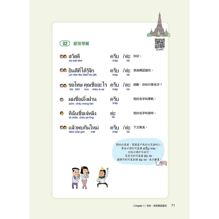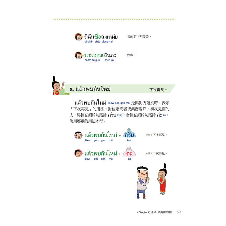 ครับ(kráp)是男性用的禮貌語尾詞、ค่ะ(kâ)則是女性用的禮貌語尾詞,泰語的一些用語男女使用有別,不過能依上表清楚念出來後!是不是開始感到有成就感了?本篇中將帶你馬上踏出泰語的第一步,講解許多與人溝通的基本表達,雖然內容不長,但是千萬不要小看這個篇章。這部分是未來敢開口的重要關鍵。基本表達滾瓜爛熟之後,就能進行更進一步的泰語學習。
