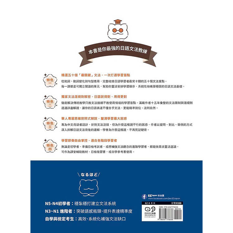 本書精選五十個最關鍵的文法,從助詞到動詞變化,再帶入句型應用,最後再說明一般文法書中沒提到的文法限制及使用上的潛規則,一步步地帶你打通學習盲點,每個單元都能自由閱讀,能照自己的節奏學習。