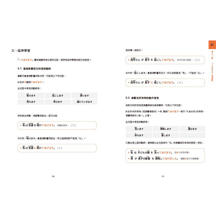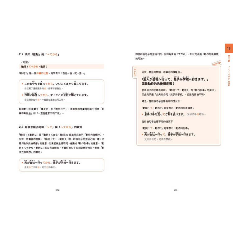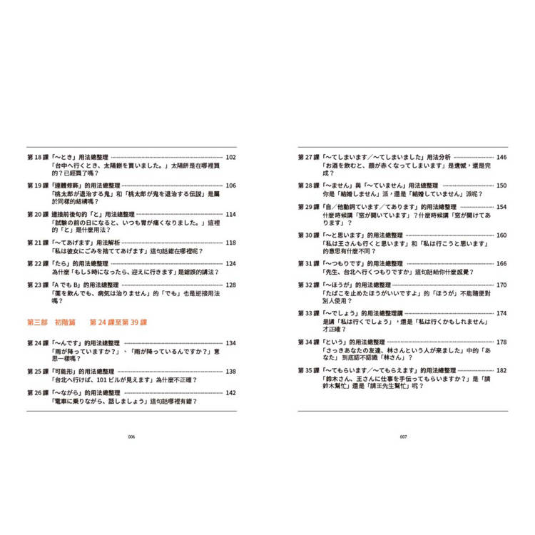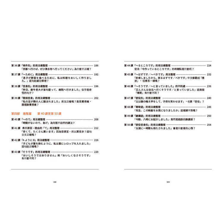 這本書就是為了解決這問題而誕生的,書本共有五十個主題,每個主題分成兩個部份,前半部份是「初級入門篇」,針對動詞變化、文法的接續及例句等做教學,後半部份是「進階篇」,把傳統文法教科書中,沒提到的文法潛規則、文法使用情境,做了詳細的說明,也因此初級學習者可以先閱讀前半入門的部份,把文法的概念培養起來,而已有日文基礎,或是進階的學習者,可以直接看後半段進階篇的部份,把自己所漏掉的文法規則或不足的地方給補起來。