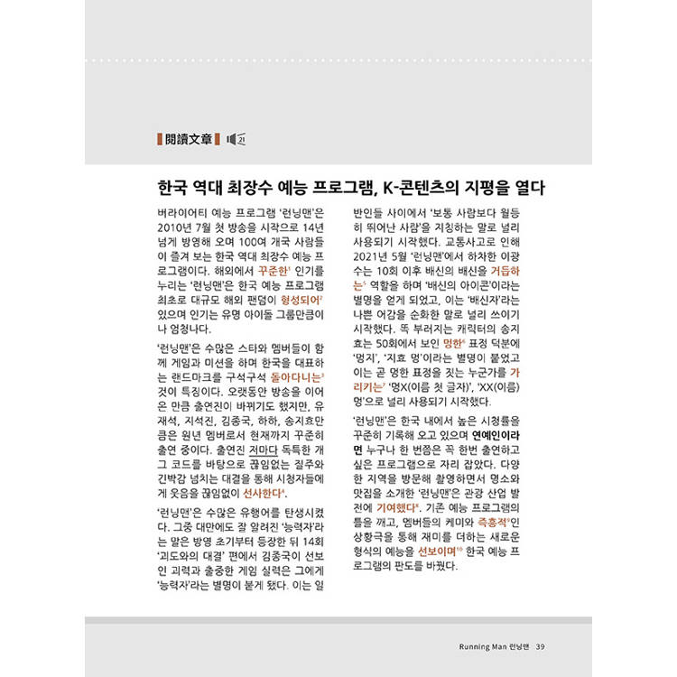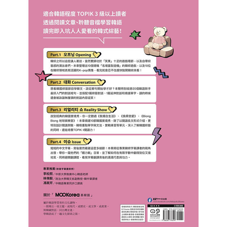 精選10部韓國實境秀,除了以閱讀長文形式介紹,更特別設計閱讀測驗、韓檢重點單字與文法、實戰練習等單元,深入了解韓國綜藝的同時,還能培養TOPIK II閱讀力!
