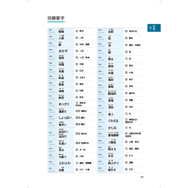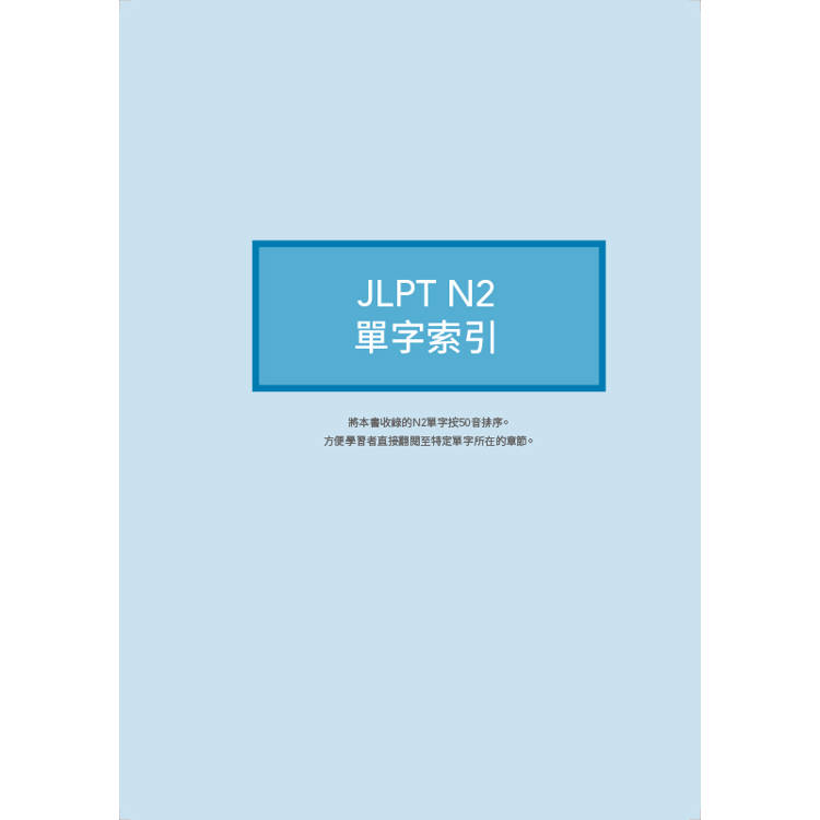 書末將全書單字按照五十音順序製成總表,讓讀者在背完全書後可隨時查找,方便總複習。也能攜帶至考場,當作考前最後快速瀏覽的衝刺準備。