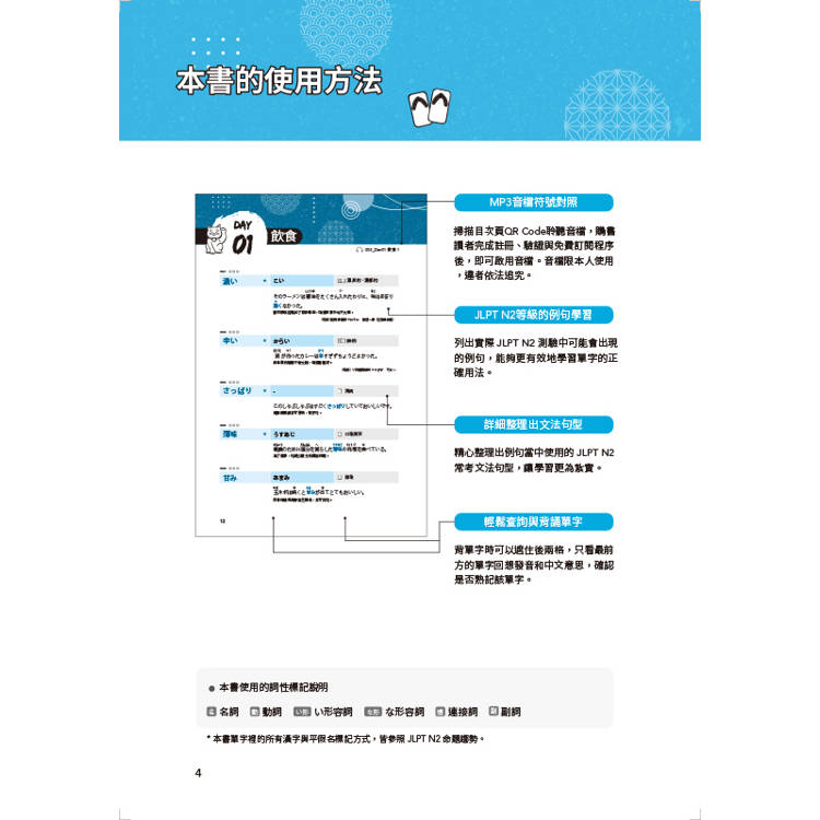收錄了接頭詞與接尾詞的一覽表,與在難度較高的例句後面附上句型提示,幫助讀者快速掌握N3到N2相關的中高階句型用法。