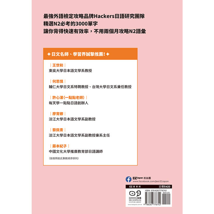本書由韓國最強日檢團隊駭客編輯,精選N2超過3000個的單字,並以人際關係、學校生活、文化、片假名等多個領域分類分成40天讀書計畫。一本就可以高效學習必考的重點字彙。