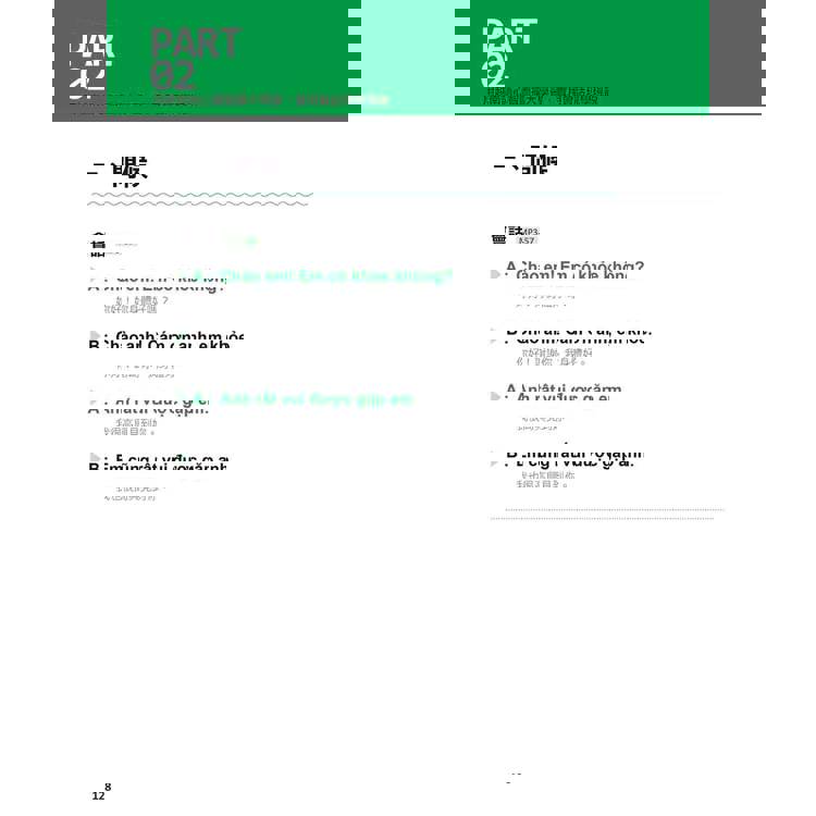 透過PART01「輕鬆學好越南語元音字母+輔音字母」,已學過264個單字、264個詞語、264個例句,在進入到PART02後,擴大延伸進入「實用情境會話」。本單元有「問候」、「介紹」、「寒暄」、「家人」、「物品」、「數字」、「時間」、「地點」、「娛樂」、「生病」10種情境,實現越南語的會話環境。每個單元皆有4句適合初學者使用的會話短句以及句型說明,並補充相關例句,充實腦內單字、會話的寶庫。