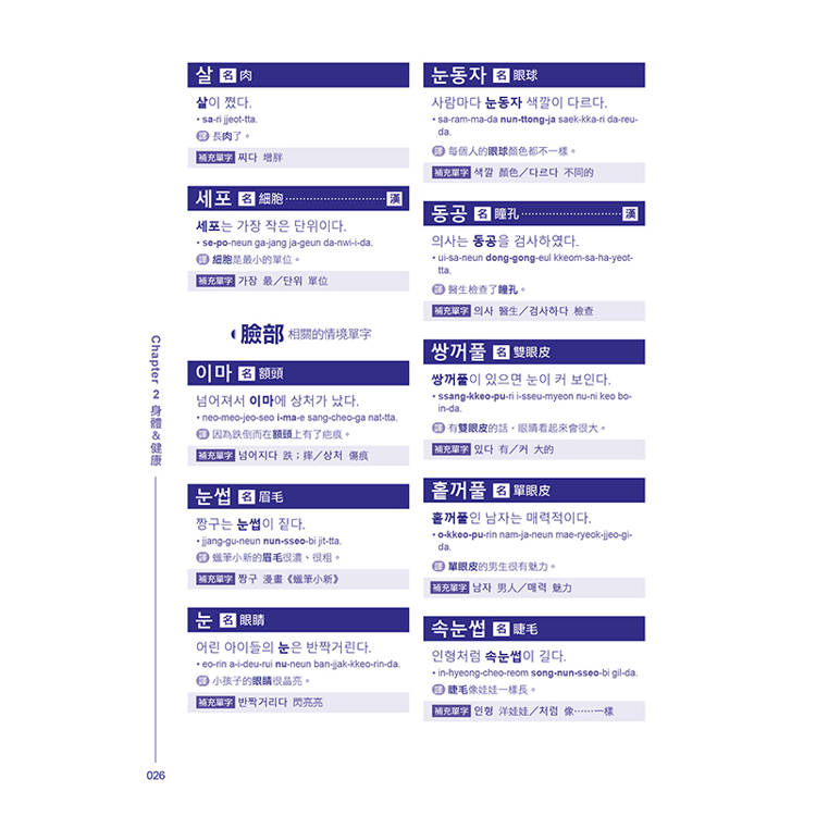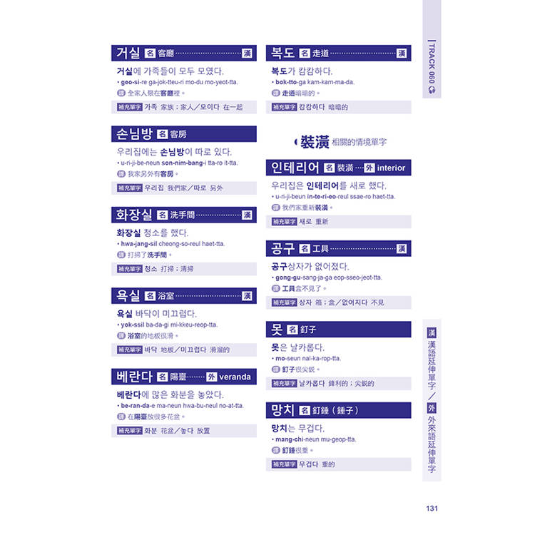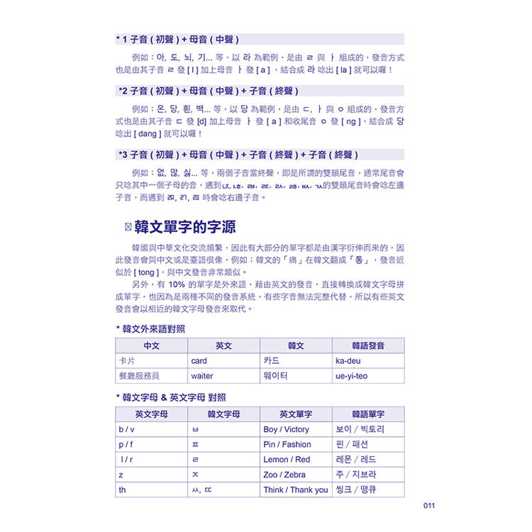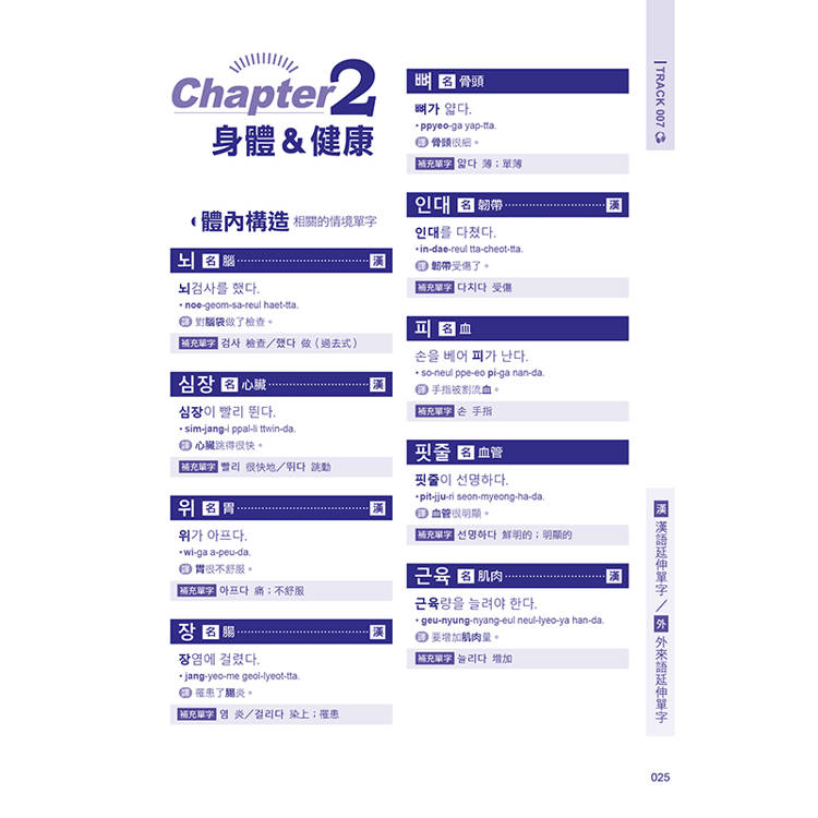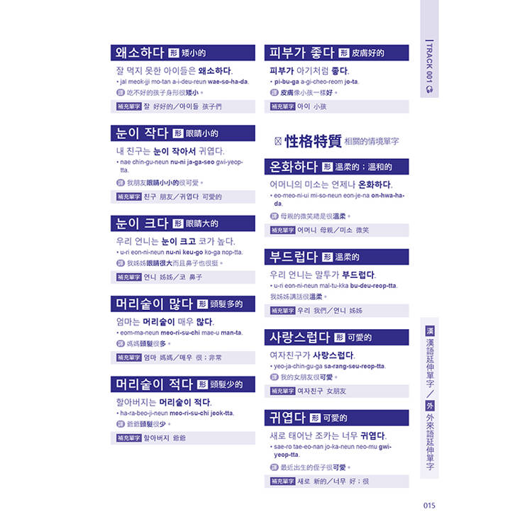 書中每個單字與例句都標示羅馬拼音,讓初學者更容易掌握韓語發音,降低自學難度。此外,特別標註詞性與「字源」(漢字詞、外來語),利用熟悉的語言背景輔助記憶,確保學習過程流暢不卡關,學習效率最大化。