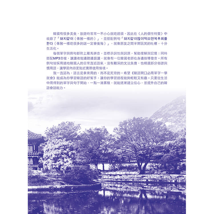 本書專為想快速開口的人設計,避開艱澀枯燥的文法規則,專注於生活必備單字與常用例句。排版簡潔清晰,採「韓文在前,中文在後」的邏輯,讓你一眼產生深刻印象,在最短時間內建立開口說韓語的自信。