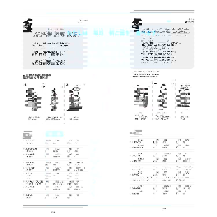 學習完平假名及片假名之後,從第三課開始進入正課。正課以簡單明瞭的7個步驟,讓學習者按部就班學習日語基礎文型,此外,更以反覆的代換練習,搭配聽、說、讀、寫的綜合練習與擬真情境會話,將所學文型真正內化,日語真的超好學,開口說日語一點都不難!