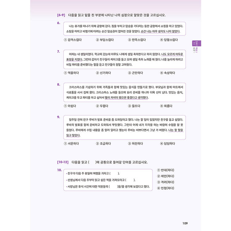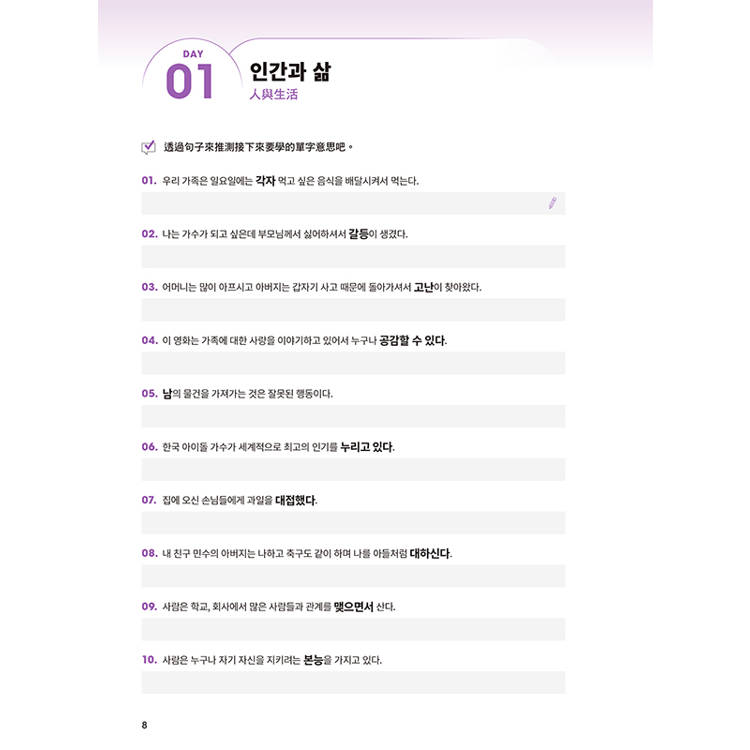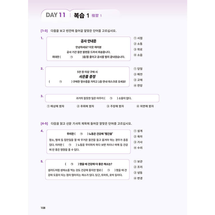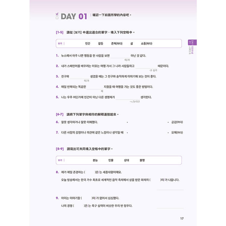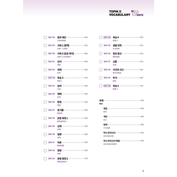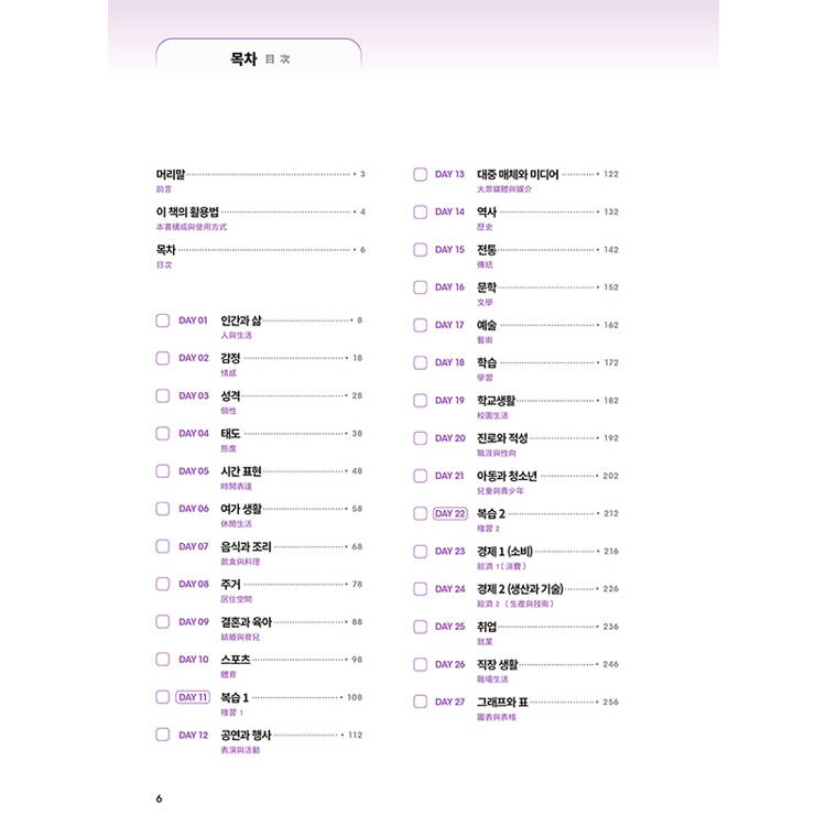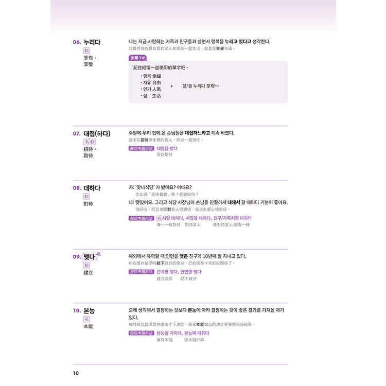 每日先透過讀韓文句子推測要學習的單字字義(準備階段),搭配例句和歷屆考題用法練習運用方式(學習階段),最後利用實戰練習題檢驗學習成果(確認階段),再加上每 10 天 1 次的複習單元,以及書末 2 回迷你模擬試題,幫助你牢牢記住並靈活運用學過的單字。