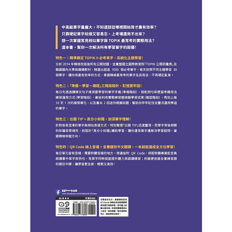 由韓國大學資深韓語教育講師共同編撰,精準剖析 TOPIK Ⅱ 歷屆公開試題,鎖定 45 大命題領域和 5 回仿韓檢複習,只需要 50 天,就能輕鬆活用 TOPIK 必考單字!
