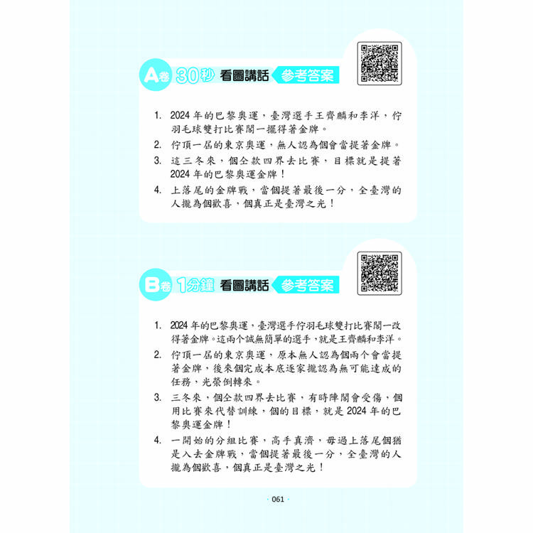 為著予學習者「會曉用」,伊建構一个完整的學習循環,鍛鍊「聽、講、讀、寫」的全方位能力。每一个主題,攏對「看圖講話」開始,刺激表達的欲望;了後提供「A 卷30 秒」佮「B卷 1 分鐘」的參考答案,是非常實用的訓練。紲落來的「情境演說」佮Q&A,是表達能力的進階。對輸入面來講,「文章朗讀」培養語感,「閱讀測驗」確認理解。上煞尾,用「語句書寫」收尾,共所學的詞彙實際運用。這一个完整的循環,對被動吸收到主動產生,予學習者毋但是「會曉聽」,閣較是「會曉用」。