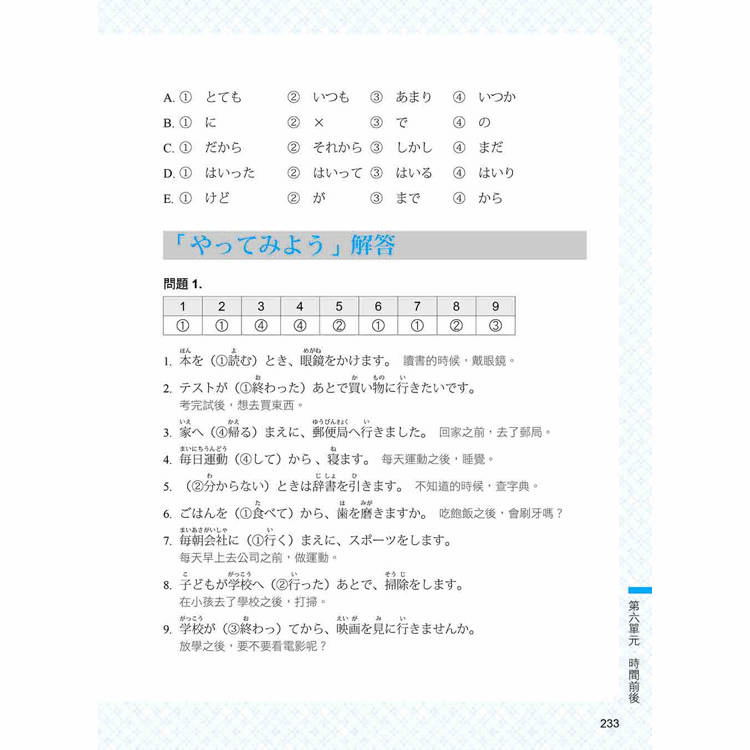輔考經驗豐富的本間名師,深入剖析新日檢N5文法‧句型的考題趨勢,統整往年必考內容,撰寫數百題模擬試題,穿插於全書,就是要您在吸收完新的文法和句型之後,立即階段驗收實力!而最後的解答,還附上原文及中文翻譯,讓您再次複習所學內容,加深記憶!這樣協助您熟悉考題的流程,絕對讓您順暢應考好輕鬆!