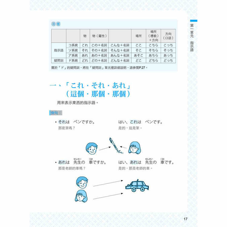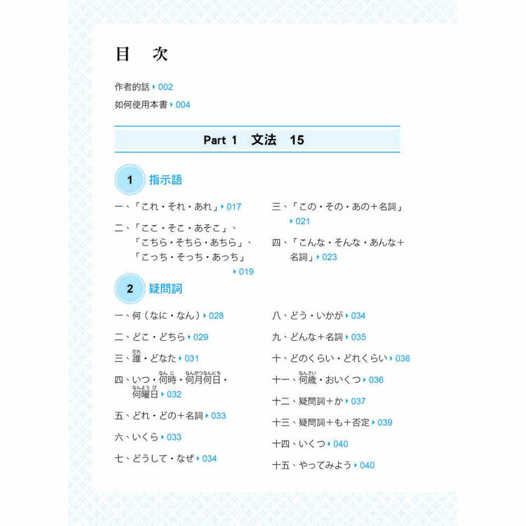 Part 1將文法分類成11個重點單元,包含「指示語」、「疑問詞」、「數量詞」、「形式」、「名詞」、「形容詞」、「動詞」、「助詞」、「接續詞」、「副詞」、「招呼用語」。