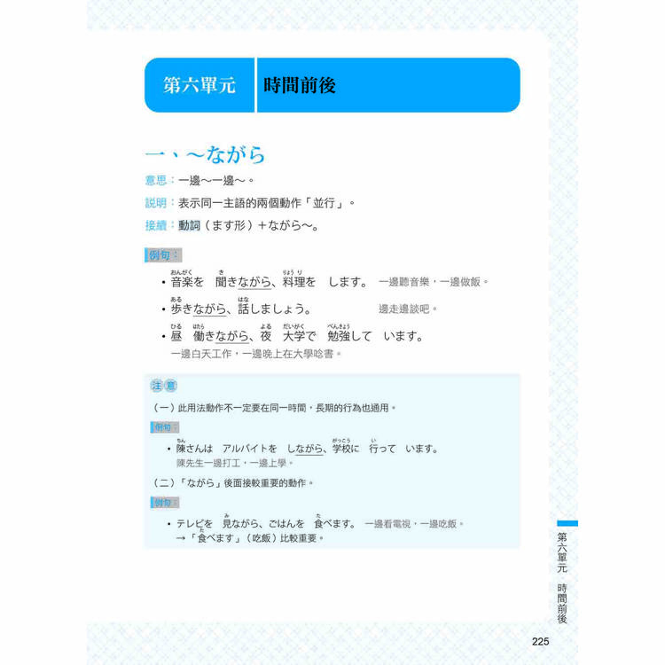 每一則文法,皆透過「意思」、「說明」、「接續」,讓學習者全盤了解如何運用該文法。而實用且精準的「例句」,簡直和真正考試的句子一模一樣。另外還搭配「注意」這種小提醒,讓容易混淆的時態與變化,瞬間脈絡清晰可見,學習文法更有效率。