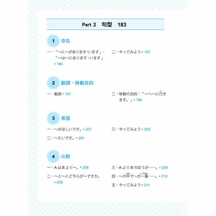 Part 2網羅以目的、功用分類的20大句型,如「存在」、「勸誘、移動目的」、「希望」、「比較」、「依賴」、「樣子‧狀態」……等等,再逐一列舉基本句型及常見用法,更以圖表統整原本令人卻步的變化規則,不管是現在式、過去式的變化,或是肯定形否定形的規則,透過表格統整更清晰。